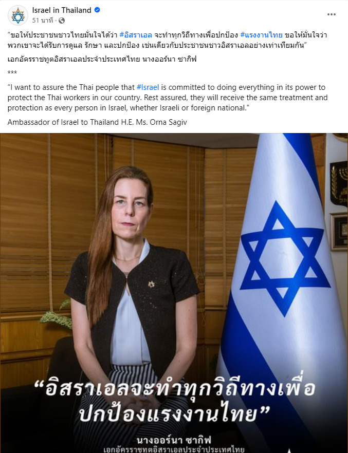 เพจเฟซบุ๊ก Israel in Thailand ซึ่งเป็นเพจของสถานเอกอัครราชทูตอิสราเอลประจำประเทศไทยเผยแพร่คำกล่าวของนางออร์นา ซากิฟ เอกอัครราชทูตอิสราเอลประจำประเทศไทย โดยระบุว่า “ขอให้ประชาชนชาวไทยมั่นใจได้ว่า #อิสราเอล จะทำทุกวิถีทางเพื่อปกป้อง #แรงงานไทย ขอให้มั่นใจว่าพวกเขาจะได้รับการดูแล รักษา และปกป้อง เช่นเดียวกับประชาชนชาวอิสราเอลอย่างเท่าเทียมกัน”