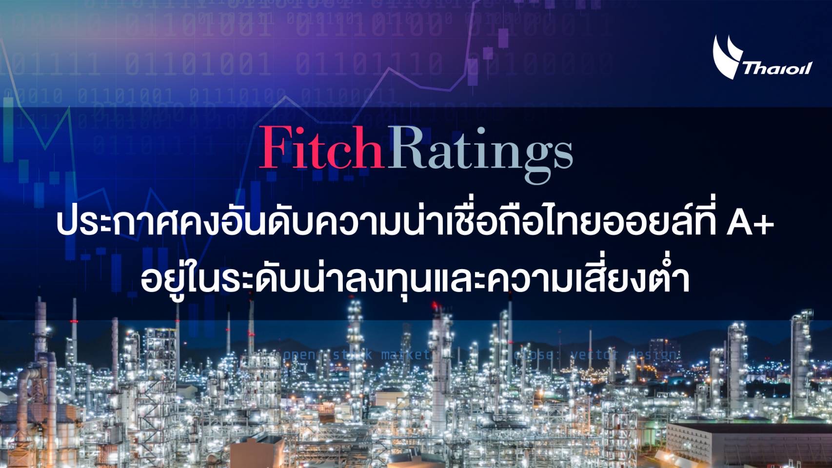 บริษัท ฟิทช์ เรทติ้งส์ (ประเทศไทย) จำกัด สถาบันจัดอันดับความน่าเชื่อถือ ได้ประกาศคงอันดับความน่าเชื่อถือ(Credit Rating) ของ บริษัท ไทยออยล์จำกัด (มหาชน) ที่ A+ ซึ่งเป็นกลุ่มบริษัทที่อยู่ในระดับที่น่าลงทุนและความเสี่ยงต่ำ นอกจากนี้ ยังได้ปรับเพิ่มมุมมองความน่าเชื่อถือ (Outlook) จากแนวโน้มเป็นลบ (Negative) เป็นระดับมีเสถียรภาพ (Stable) โดยมีมุมมองว่า ฐานะทางการเงินของบริษัทฯ จะปรับตัวดีขึ้นในปี 2568 หลังจากที่โครงการพลังงานสะอาด (CFP) เริ่มดำเนินการ