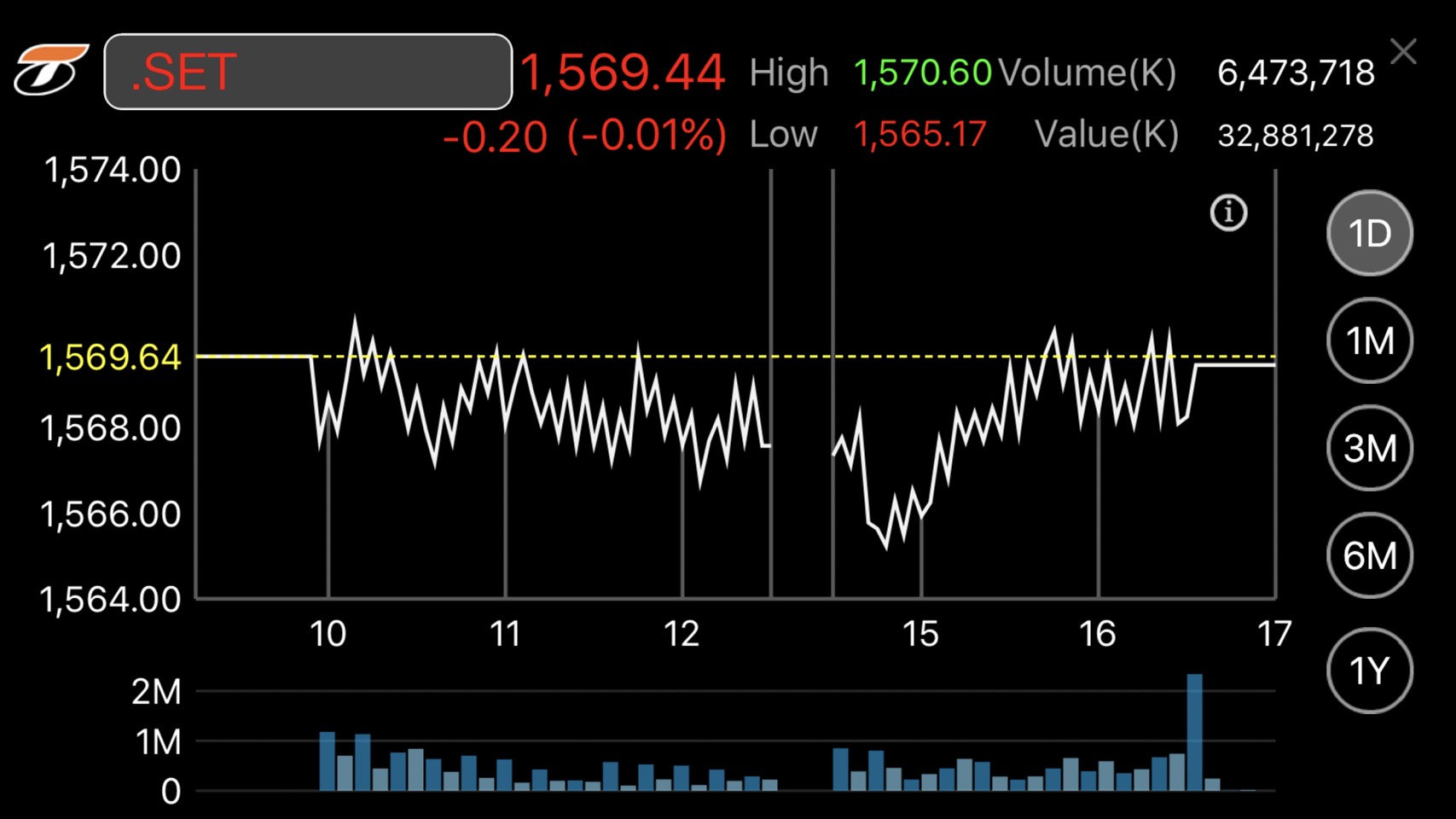 ผู้สื่อข่าวรายงานว่าดัชนีตลาดหลักทรัพย์ฯ ปิดวันนี้ที่ระดับ 1,569.44 จุด ลดลง 0.20 จุด หรือร้อยละ 0.01 มูลค่าการซื้อขาย 32,881.28 ล้านบาท การซื้อขายดัชนีเคลื่อนไหวแดนลบเป็นส่วนใหญ่ โดยดัชนีฯ แตะจุดสูงสุดที่ 1,570.60 จุด และต่ำสุดที่ระดับ 1,565.17 จุด