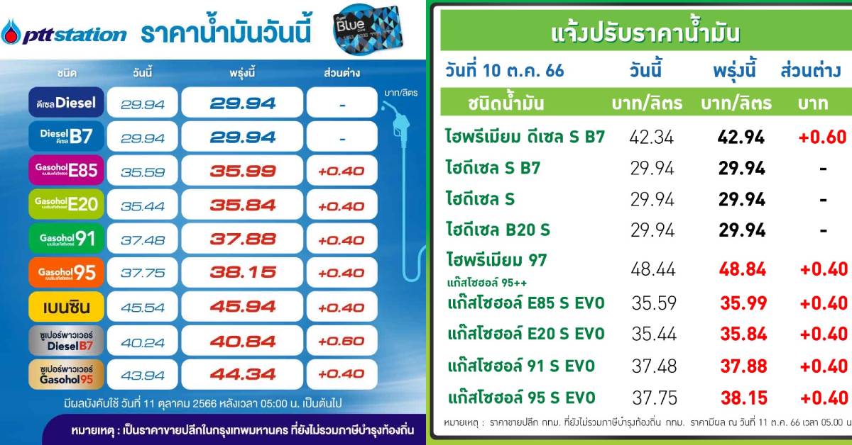 กทม. 10 ต.ค.-PTT Station – บางจาก ปรับราคาขายปลีกน้ำมันเบนซินและแก๊สโซฮอล์ทุกชนิดขึ้น 40 สตางค์/ลิตร พรีเมี่ยม GSH95 และ Premium ดีเซล เพิ่มขึ้น 40 สตางค์/ลิตร เว้นกลุ่มดีเซลคงเดิม มีผล 11 ต.ค. 2566 เวลา 05.00 น. เป็นต้นไป