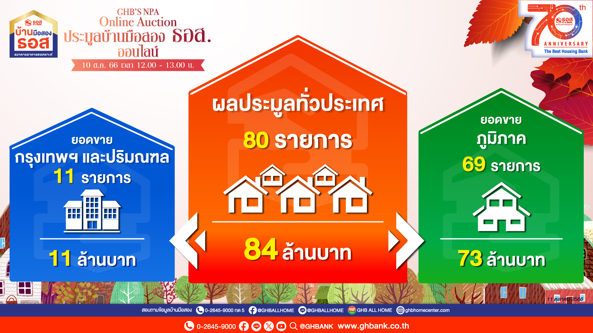 ธนาคารอาคารสงเคราะห์ (ธอส.) รายงานผลการประมูลบ้านมือสอง ธอส. ออนไลน์ 10.10 GHB’S NPA Online Auction ผ่าน Application : GHB ALL HOME ที่จัดขึ้นวานนี้ (10 ตุลาคม 2566) พร้อมกันทั่วประเทศ