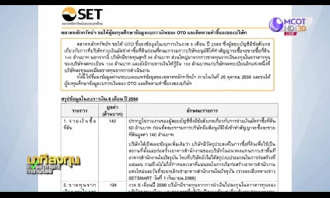 วันนี้ ตลาดหลักทรัพย์แห่งประเทศไทย ขอให้บมจ.วันทูวัน คอนแทคส์ (OTO) ชี้แจงข้อมูลในงบการเงินงวด 6 เดือน ปี 66 ซึ่งผู้สอบบัญชีมีข้อสังเกตเกี่ยวกับการที่บริษัทจ่ายเงินมัดจำค่าซื้อที่ดินก่อนที่คณะกรรมการบริษัทอนุมัติให้ทำสัญญาจะซื้อจะขายซื้อที่ดิน 140 ล้านบาท