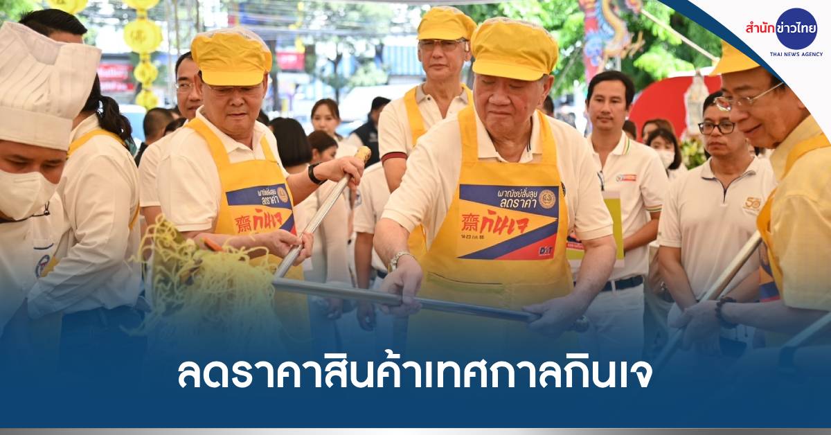 ทัังนี้ สินค้าที่นำมาลดราคา ประกอบด้วย กลุ่ม 1 วัตถุดิบ เครื่องปรุง อาหารเจ 86 ราย ประกอบด้วย ผู้ผลิต ห้างค้าปลีก-ค้าส่ง ร้านสะดวกซื้อ ห้างท้องถิ่น กลุ่ม 2 อาหารปรุงสำเร็จ เมนูทางเลือกราคาประหยัด ราคา 30-45 บาท 448 แห่ง ประกอบด้วยตลาดกลาง ตลาดสด ร้านอาหารธงฟ้า ห้างค้าปลีก-ค้าส่ง ห้างท้องถิ่น และกลุ่ม 3 Mobile ธงฟ้า จำหน่ายสินค้าจำเป็น สินค้าเจ และผักเจ 100 จุดทั่วกรุงเทพ และนิคมอุตสาหกรรม 7 จุด ลดราคามากถึง 70% ตามแต่ต้นทุนของสินค้า โดยเทศกาลกินเจที่จะเกิดขึ้นตั้งแต่วันนี้เป็นต้นไป และวันนี้เป็นวันล้างท้อง กระทรวงพาณิชย์ได้เห็นความสำคัญในสิ่งที่พี่น้องประชาชนให้ความสนใจและถือปฏิบัติมาเป็นเวลานานทุกปี เราอยากจะเห็นพี่น้องประชาชนเข้าร่วมเทศกาลกินเจได้มีโอกาสเข้าถึงสินค้าราคาถูก สามารถรับประทานผักผลไม้ในราคาที่ถูก จึงได้ร่วมมือกับพันธมิตร นำสินค้าราคาถูก มาจำหน่ายให้กับพี่น้องประชาชน และยังได้เจาะลึกไปยังแหล่งชุมชน แหล่งที่มีแรงงาน ผู้มีรายได้น้อยอยู่อาศัย เพื่อช่วยลดภาระค่าครองชีพ ตามนโยบายที่กระทรวงพาณิชย์ตั้งใจดำเนินการให้พี่น้องประชาชน