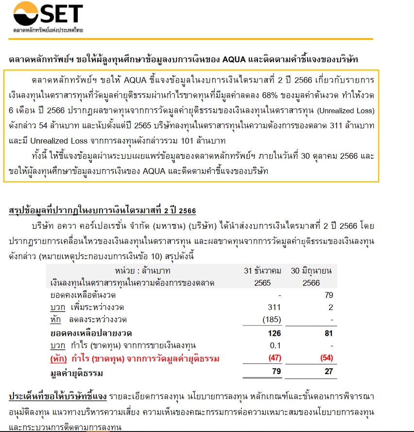 ตลาดหลักทรัพย์แห่งประเทศไทย (ตลท.) ขอให้AQUA ชี้แจงข้อมูลในงบการเงิน ไตรมาสที่ 2/66 เกี่ยวกับรายการเงินลงทุนในตราสารทุนที่วัดมูลค่ายุติธรรมผ่านกำไรขาดทุนที่มีมูลค่าลดลง 68% ของมูลค่าต้นงวด ทำให้งวด 6 เดือน ปี 2566 ปรากฏผลขาดทุนจากการวัดมูลค่ายุติธรรมของเงินลงทุนในตราสารทุน (Unrealized Loss) ดังกล่าว 54 ล้านบาท และนับตั้งแต่ปี 2565 บริษัทลงทุนในตราสารทุนในความต้องการของตลาด 311 ล้านบาท และมี Unrealized Loss จากการลงทุนดังกล่าวรวม 101 ล้านบาท