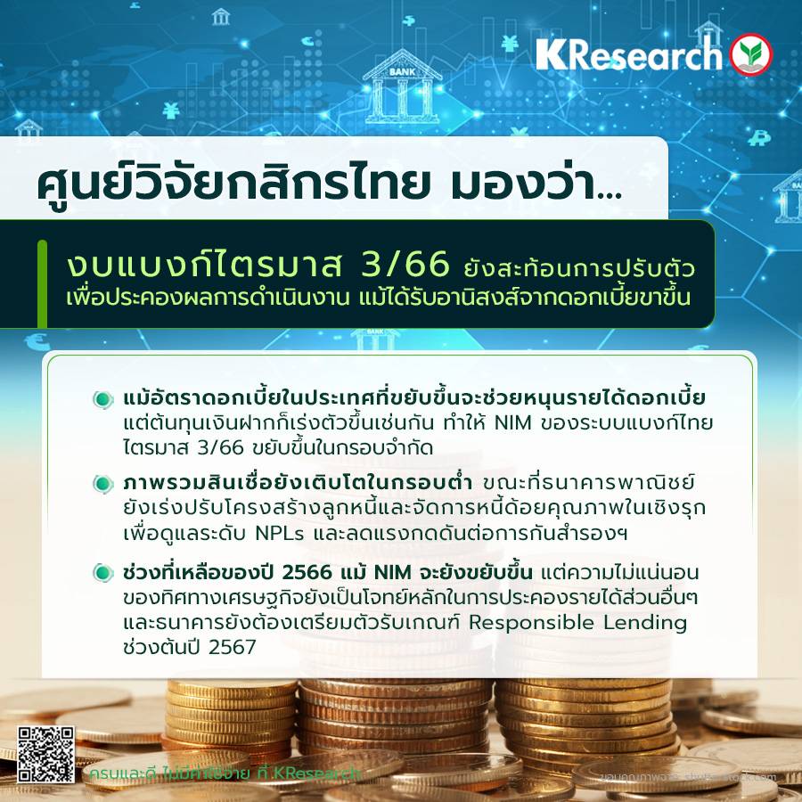 ศูนย์วิจัยกสิกรไทย คาดว่า กำไรสุทธิของระบบแบงก์ไทย ในช่วง 9 เดือนแรกของปี 2566 น่าจะทำได้ในกรอบประมาณ 1.86-1.91 แสนล้านบาท ขณะที่คาดว่า รายได้จากดอกเบี้ยสุทธิยังน่าจะเติบโตต่อเนื่อง และเป็นแรงหนุนสำคัญของผลประกอบการในไตรมาสสุดท้ายของปี 2566 เพราะ NIM ของระบบแบงก์ไทยยังมีแนวโน้มปรับตัวสูงขึ้น อย่างไรก็ดี การประคองผลการดำเนินงานท่ามกลางความไม่แน่นอนของทิศทางเศรษฐกิจทั้งในและต่างประเทศ ยังคงเป็นโจทย์ที่กระตุ้นให้ธนาคารพาณิชย์ต้องเร่งปรับตัว ดังนั้น ในไตรมาสสุดท้ายของปี 2566 จะยังคงเห็นความพยายามของธนาคารพาณิชย์ในการจัดการปัญหา NPLs พร้อมๆ กับการเตรียมสภาพคล่อง เพื่อพร้อมรองรับความต้องการใช้สภาพคล่องในระบบที่อาจเพิ่มขึ้นตามมาตรการกระตุ้นเศรษฐกิจของภาครัฐ
