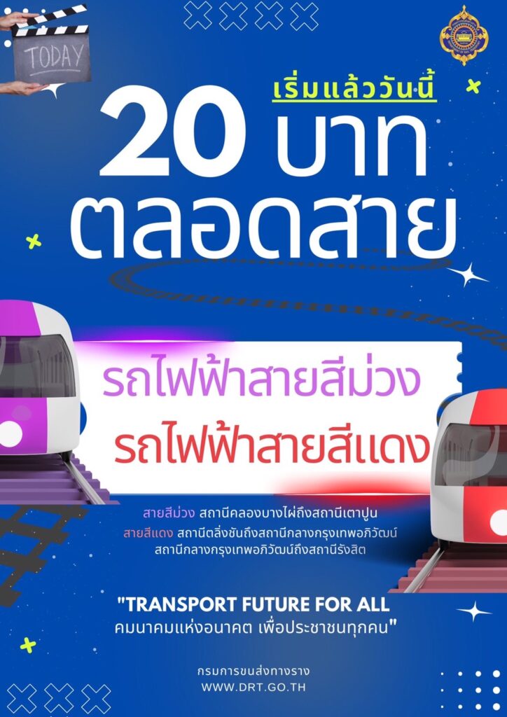 นายพิเชฐ คุณธรรมรักษ์ อธิบดีกรมการขนส่งทางราง เปิดเผยว่า ภายหลังจากเมื่อวันที่ 16 ต.ค.66 คณะรัฐมนตรีมีมติอนุมัติในหลักการในการดำเนินมาตรการอัตราค่าโดยสารสูงสุด 20 บาทตลอดสาย ตามนโยบายรัฐบาล สำหรับรถไฟชานเมืองสายสีแดง สายนครวิถี (กรุงเทพอภิวัฒน์ – ตลิ่งชัน) และสายธานีรัถยา (กรุงเทพอภิวัฒน์ – รังสิต) ของการรถไฟแห่งประเทศไทย (รฟท.) และรถไฟฟ้ามหานคร สายฉลองรัชธรรม (สายสีม่วง) ของการรถไฟฟ้าขนส่งมวลชนแห่งประเทศไทย (รฟม.) ตามที่กระทรวงคมนาคมเสนอ