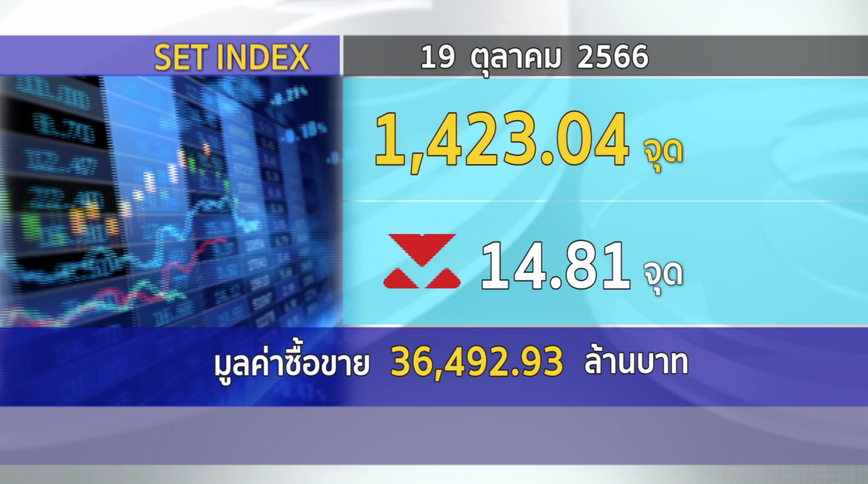 กทม. 19 ต.ค.- SET ปิดวันนี้ที่ 1,423.04 จุด ลดลง 14.81 จุด (-1.03%) มูลค่าการซื้อขาย 36,492.93 ล้านบาท