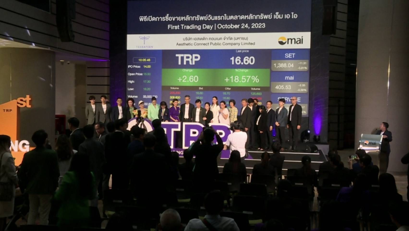 นายประพันธ์ เจริญประวัติ ผู้จัดการตลาดหลักทรัพย์ เอ็ม เอ ไอ และ ผศ.นพ.ชลธิศ สินรัชตานันท์ ประธานเจ้าหน้าที่บริหาร บมจ. เอสเตติก คอนเนค พร้อมผู้บริหาร ร่วมพิธีเปิดการซื้อขายหลักทรัพย์วันแรก (24 ต.ค.) ในตลาด เอ็ม เอไอ ของ บมจ. เอสเตติก คอนเนค ผู้ให้บริการศัลยกรรมความงามบนใบหน้า ภายใต้ชื่อ “ธีรพรคลินิก” ด้วยมูลค่าหลักทรัพย์ ณ ราคา IPO 4,900 ล้านบาท โดยใช้ชื่อย่อในการซื้อขายหลักทรัพย์ว่า “TRP”
