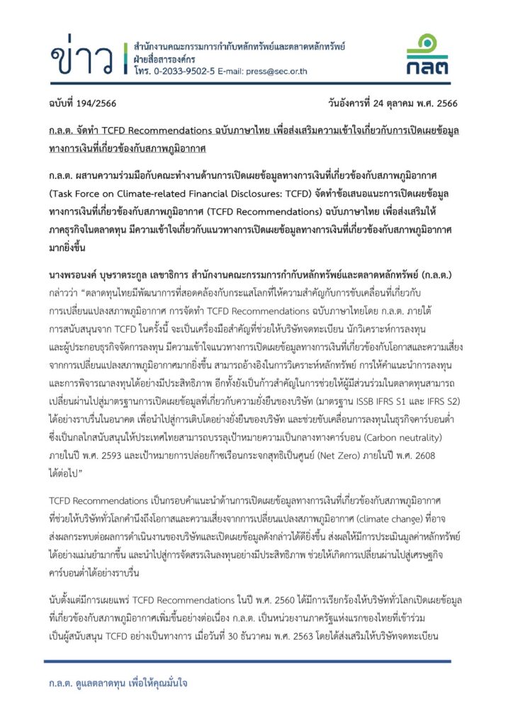 กรุงเทพฯ 24 ต.ค.- ก.ล.ต. ผนึก TCFD จัดทำข้อเสนอแนะการเปิดเผยข้อมูลทางการเงินที่เกี่ยวข้องกับสภาพภูมิอากาศ (TCFD Recommendations) ฉบับภาษาไทย ส่งเสริมความเข้าใจภาคธุรกิจในตลาดทุนธ