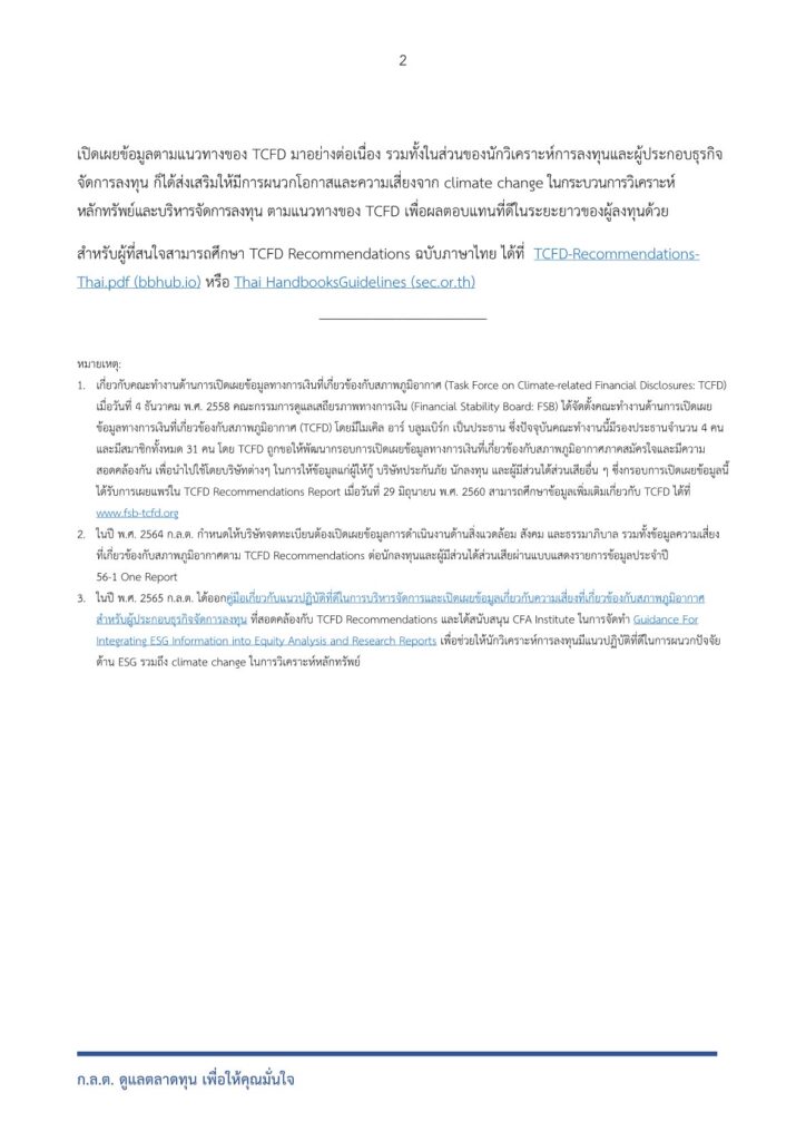 นับตั้งแต่มีการเผยแพร่ TCFD Recommendations ในปี พ.ศ. 2560 ได้มีการเรียกร้องให้บริษัททั่วโลกเปิดเผยข้อมูลที่เกี่ยวข้องกับสภาพภูมิอากาศเพิ่มขึ้นอย่างต่อเนื่อง ก.ล.ต. เป็นหน่วยงานภาครัฐแห่งแรกของไทยที่เข้าร่วมเป็นผู้สนับสนุน TCFD อย่างเป็นทางการ เมื่อวันที่ 30 ธันวาคม พ.ศ. 2563 โดยได้ส่งเสริมให้บริษัทจดทะเบียนเปิดเผยข้อมูลตามแนวทางของ TCFD มาอย่างต่อเนื่อง รวมทั้งในส่วนของนักวิเคราะห์การลงทุนและผู้ประกอบธุรกิจจัดการลงทุน ก็ได้ส่งเสริมให้มีการผนวกโอกาสและความเสี่ยงจาก climate change ในกระบวนการวิเคราะห์หลักทรัพย์และบริหารจัดการลงทุน ตามแนวทางของ TCFD เพื่อผลตอบแทนที่ดีในระยะยาวของผู้ลงทุนด้วย สำหรับผู้ที่สนใจสามารถศึกษา TCFD Recommendations ฉบับภาษาไทย ได้ที่ https://assets.bbhub.io/company/sites/60/2023/10/TCFD-Recommendations-Thai.pdf หรือhttps://assets.bbhub.io/company/sites/60/2023/10/TCFD-Recommendations-Thai.pdf .-สำนักข่าวไทย