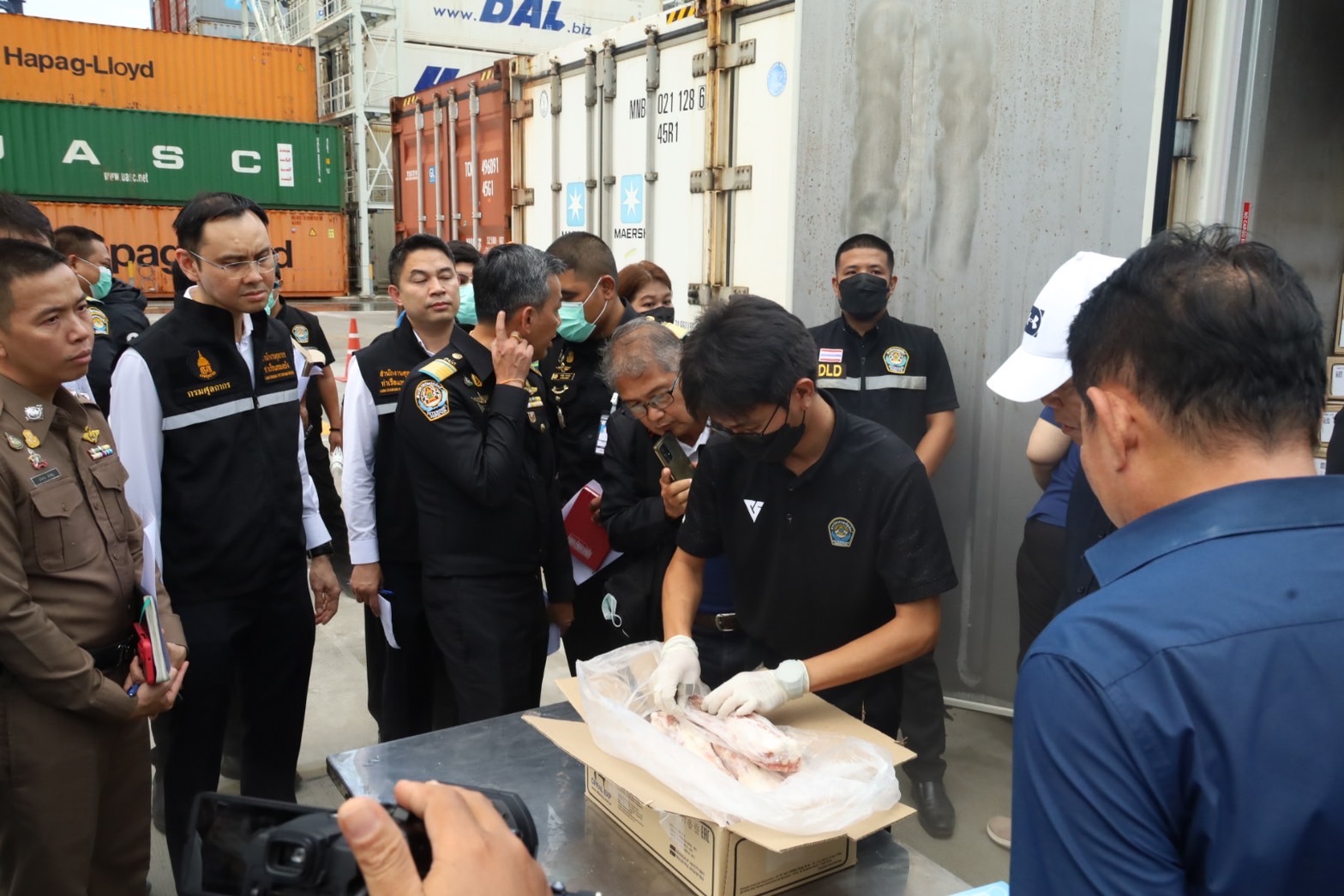 นายพันธ์ทอง ลอยกุลนันท์ โฆษกกรมศุลกากร เปิดเผยว่า นายกรัฐมนตรี สั่งการให้กรมศุลกากร เร่งจัดส่งเนื้อและชิ้นส่วนสุกรที่เป็นของกลาง 161 ตู้ ส่งมอบให้กรมปศุสัตว์นำไปทำลาย และปราบปรามการลักลอบหลีกเลี่ยงนำเข้าเนื้อสุกรเชิงรุก ขณะนี้ตู้เก็บความเย็นอายัดไว้ในท่าเรือแหลมฉบัง 92 ตู้ ได้เปิดสำรวจเรียบร้อยแล้ว พบเป็นเนื้อและเครื่องในสุกรจากประเทศบราซิล เนเธอแลนด์ และเกาหลีใต้ 13 ตู้ น้ำหนักรวม 343,070 กิโลกรัม และสินค้าเกษตรอื่นๆ เช่น ชิ้นส่วนไก่ เนื้อและเครื่องในโคกระบือ 79 ตู้ น้ำหนักรวม 2.216 ล้านกิโลกรัม ได้ประสานกับกรมปศุสัตว์ เพื่อส่งมอบและนำไปทำลายตามนโยบายของนายกรัฐมนตรี