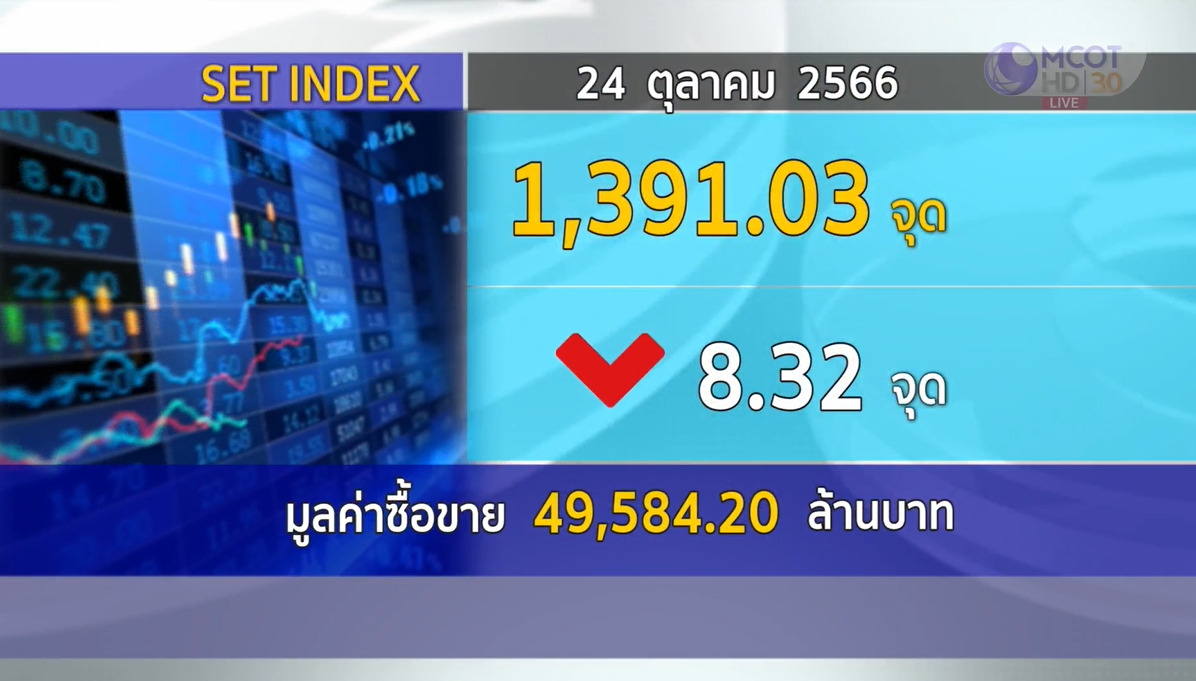 กทม. 24 ต.ค.-SET ปิดวันนี้ที่ 1,391.03 จุด ลดลง 8.32 จุด (-0.59%) มูลค่าการซื้อขาย 49,584.20 ล้านบาท