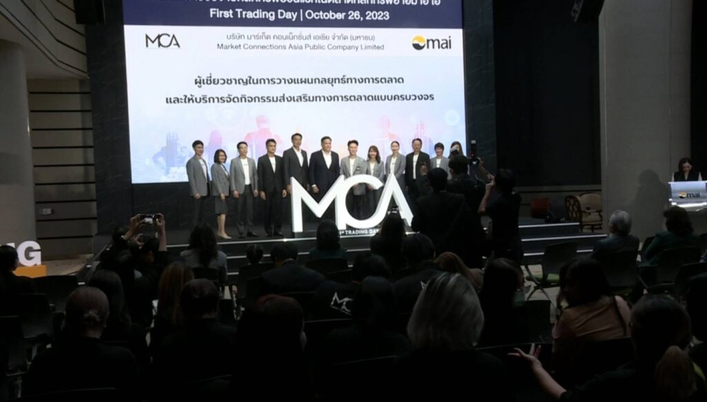 นายแมนพงศ์ เสนาณรงค์ รองผู้จัดการ หัวหน้าสายงานผู้ออกหลักทรัพย์ ตลาดหลักทรัพย์แห่งประเทศไทย (ตลท.) นายประพันธ์ เจริญประวัติ ผู้จัดการตลาดหลักทรัพย์ เอ็ม เอ ไอ (mai) และนายภักดี เหล่างาม ประธานเจ้าหน้าที่บริหาร บมจ. มาร์เก็ต คอนเน็กชั่นส์ เอเชีย พร้อมด้วยผู้บริหาร เข้าร่วมในพิธีเปิดการซื้อขายหลักทรัพย์วันแรก (26 ต.ค.) ในตลาดหลักทรัพย์ mai ของ บมจ. มาร์เก็ต คอนเน็กชั่นส์ เอเชีย ในหมวดธุรกิจบริการ (Service) โดยใช้ชื่อย่อในการซื้อขายหลักทรัพย์ว่า “MCA” เปิดเทรดวันแรกที่ราคา 3.00 บาท ลดลง 0.30 บาท จากราคา IPO 3.30 บาท หรือลดลง 10%