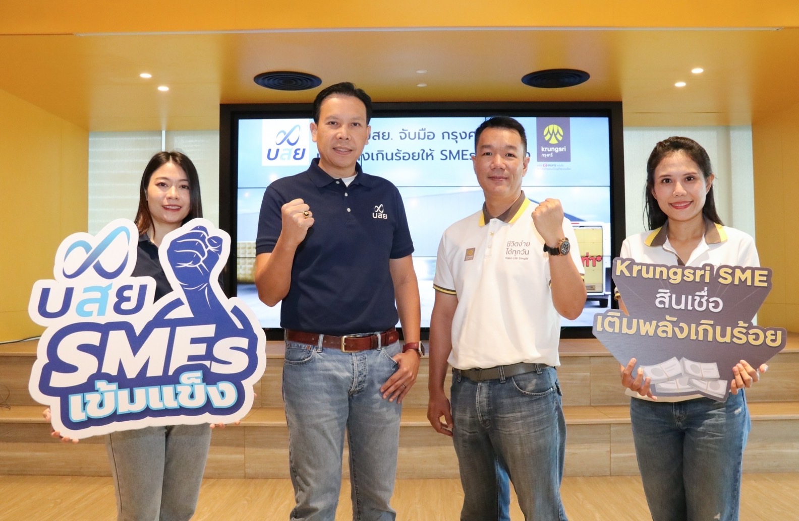 นายกิตติพงษ์ บุรณศิริ รองผู้จัดการทั่วไป สายงานกลยุทธ์และผลิตภัณฑ์ บรรษัทประกันสินเชื่ออุตสาหกรรมขนาดย่อม(บสย.) นายพีรกิตติ์ จิรเชษฐากุล ผู้บริหารสายงานกลุ่มลูกค้าธุรกิจรายย่อย ธนาคารกรุงศรีอยุธยา จำกัด (มหาชน) ผนึกกำลังช่วยผู้ประกอบการ SMEs รายเล็กกู้ในนามบุคคลธรรมดา ที่ต้องการลงทุน เสริมแกร่งแพ็คคู่ เพิ่มสภาพคล่องทางการเงิน ด้วย “Krungsri SME สินเชื่อเติมพลังเกินร้อย” และโครงการค้ำประกันสินเชื่อ บสย. PGS 10 Smart One วงเงินโครงการรวม 1,000 ล้านบาท