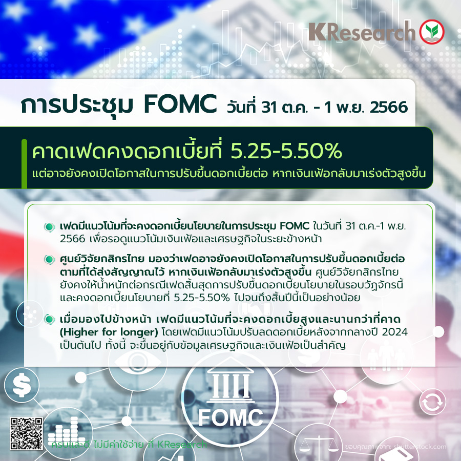 ศูนย์วิจัยกสิกรไทย ระบุ เฟดมีแนวโน้มที่จะคงดอกเบี้ยนโยบายในการประชุม FOMC วันที่ 31 ต.ค.-1 พ.ย. 2566 เพื่อรอดูแนวโน้มเงินเฟ้อและเศรษฐกิจในระยะข้างหน้า โดยแม้ว่าเงินเฟ้อจะยังคงสูงกว่าเป้าหมายและตลาดแรงงานยังคงค่อนข้างแข็งแกร่ง แต่เมื่อมองไปข้างหน้าเศรษฐกิจสหรัฐฯ มีแนวโน้มที่จะชะลอตัวลงตามเงินออมที่ลดลงและต้นทุนทางการเงินที่เพิ่มสูงขึ้นจากการปรับขึ้นดอกเบี้ยนโยบายอย่างรวดเร็วในช่วงที่ผ่านมา นอกจากนี้ เศรษฐกิจสหรัฐฯ ยังเผชิญความเสี่ยงที่เพิ่มขึ้นจากการชะลอตัวของเศรษฐกิจโลก ท่ามกลางปัจจัยด้านภูมิรัฐศาสตร์ที่ยังเป็นความไม่แน่นอนที่สำคัญ