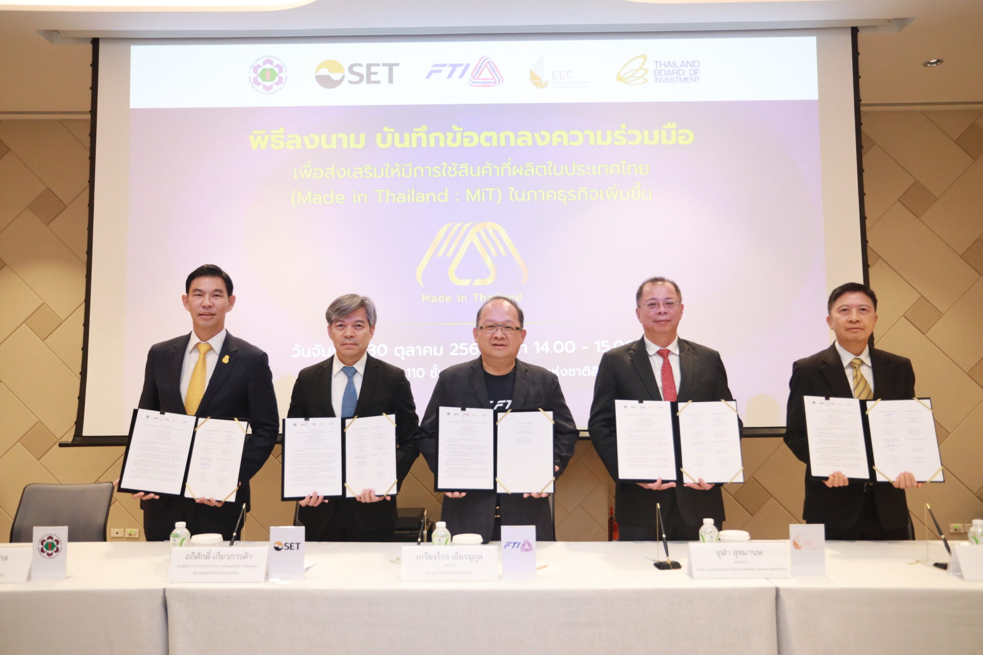ศูนย์ประชุมแห่งชาติสิริกิติ์ 30 ต.ค.-สภาอุตสาหกรรมแห่งประเทศไทย (ส.อ.ท.) ลงนามบันทึกข้อตกลงความร่วมมือ กับ 4 หน่วยงาน ได้แก่ การนิคมอุตสาหกรรมแห่งประเทศไทย (กนอ.) ตลาดหลักทรัพย์แห่งประเทศไทย (SET) สำนักงานคณะกรรมการนโยบายเขตพัฒนาพิเศษภาคตะวันออก (EEC) และสำนักงานคณะกรรมการส่งเสริมการลงทุน (BOI) ส่งเสริมให้มีการใช้สินค้าที่ผลิตในประเทศไทย (Made in Thailand: MiT) ในภาคธุรกิจเพิ่มขึ้น และมีความยั่งยืน