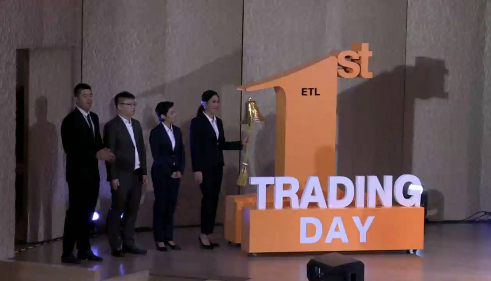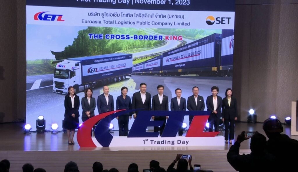 นายแมนพงศ์ เสนาณรงค์ รองผู้จัดการ หัวหน้าสายงานผู้ออกหลักทรัพย์ ตลาดหลักทรัพย์แห่งประเทศไทย (ตลท.) และนางสาวกฤชวรรณ ซื้อเจริญชัย กรรมการผู้จัดการบริษัท ยูโรเอเชีย โทเทิล โลจิสติกส์ จำกัด (มหาชน) พร้อมผู้บริหาร ร่วมพิธีเปิดการซื้อขายหลักทรัพย์วันแรก (1 พ.ย.) ในตลาดหลักทรัพย์ฯ ของ บมจ. ยูโรเอเชีย โทเทิล โลจิสติกส์ ในกลุ่มบริการ หมวดขนส่งและโลจิสติกส์ โดยใช้ชื่อย่อในการซื้อขายหลักทรัพย์ว่า “ETL” เปิดเทรดวันแรกที่ราคา 1.35 บาท ลดลง 0.33 บาท จากราคา IPO 1.68 บาทหรือลดลง 19.64 %