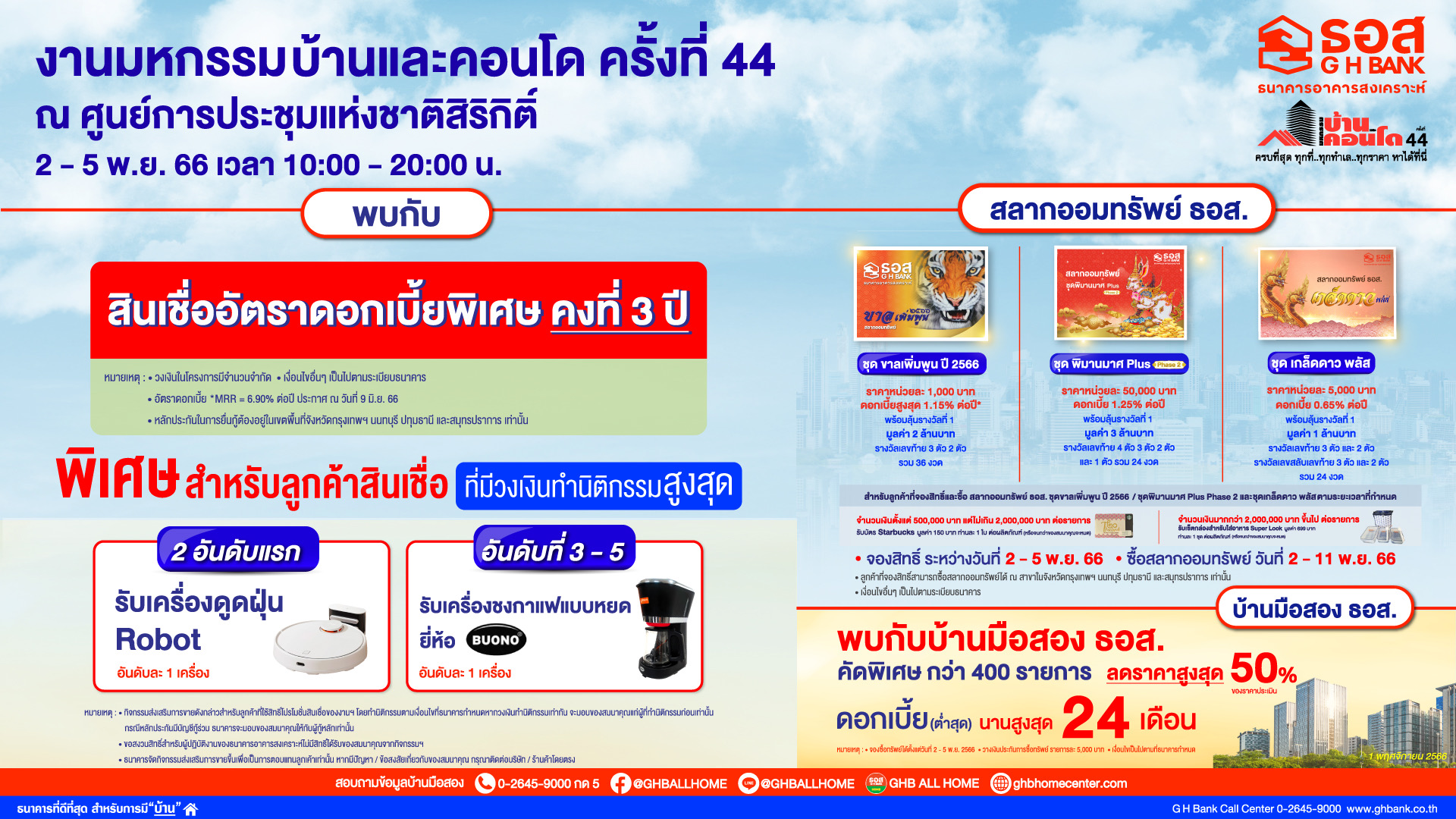 ทั้งนี้ ลูกค้าที่ใช้บริการผลิตภัณฑ์ทางการเงินตามเงื่อนไข และระยะเวลาที่ธนาคาร กำหนดจะได้รับของสมนาคุณฟรีอีกมากมาย โดยงานมหกรรมบ้านและคอนโด ครั้งที่ 44 จัดขึ้นระหว่างวันที่ 2 – 5 พฤศจิกายน 2566 ณ ศูนย์การประชุมแห่งชาติสิริกิติ์ สอบถามรายละเอียดเพิ่มเติมได้ที่ G H Bank Call Center โทร 0-2645-9000 หรือ Facebook Fanpage ธนาคารอาคารสงเคราะห์ และติดตามข่าวสารของธนาคารได้ที่ Mobile Application : GHB ALL GEN และ www.ghbank.co.th.-สำนักข่าวไทย