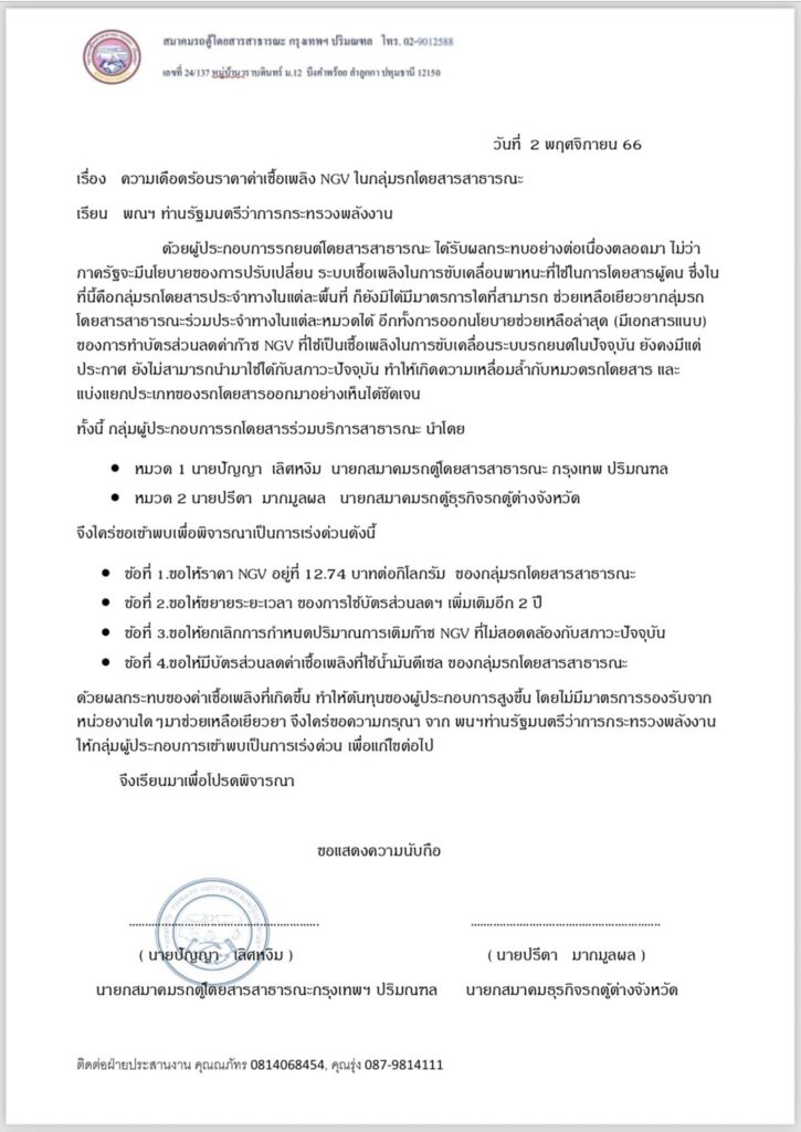 นายปัญญา เลิศหงิม นายกสมาคมรถตู้โดยสารสาธารณะ กรุงเทพฯ ปริมณฑลกล่าวว่าวันที่ 2 พ.ย.66 เวลา 09.00 น. กลุ่มผู้ประกอบการรถโดยสารร่วมบริการสาธารณะ จะนำรถโดยสารสาธารณะทุกประเภท ประมาณ 200-300 คันไปที่กระทรวงพลังงาน เพื่อยื่นหนังสือถึงพลังงาน เรื่องความเดือดร้อนจาราคา เอ็นจีวี ที่ปรับขึ้น โดยยื่น 4 ข้อเสนอดังนี้ คือ 1.ขอให้ราคาก๊าซเอ็นจีวีอยู่ที่ 12.74 บาทต่อกิโลกรัม (กก.) ของกลุ่มรถโดยสารสาธารณะ 2.ขอให้ขยายระยะเวลา ของการใช้บัตรส่วนลดฯ เพิ่มเติมอีก 2 ปี 3.ขอให้ยกเลิกการกำหนดปริมาณการเติมก๊าซเอ็นจีวีที่ไม่สอดคล้องกับสภาวะปัจจุบัน และ 4.ขอให้มีบัตรส่วนลดค่าเชื้อเพลิงที่ใช้น้ำมันดีเซล ของกลุ่มรถโดยสารสาธารณะ.–สำนักข่าวไทย