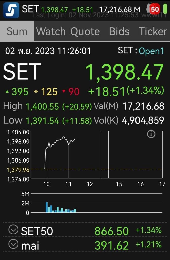 กรุงเทพฯ 2 พ.ย. – หุ้นไทยพุ่งแรงตามหุ้นเอเชียหลังเฟดคงดอกเบี้ย ส่งผลบอนด์ยีลด์ดิ่ง ด้านบาทไทยแข็งค่าขึ้น โดยตลาดหุ้นไทยภาคเช้าปรับตัวขึ้นต่อเนื่องกว่า 20 จุด แตะ 1,400 จุด เมื่อเวลา 11.26 น. ดัชนี SET มาอยู่ที่ 1,398.47จุด เพิ่มขึ้น 18.51 จุด (+1.34%)