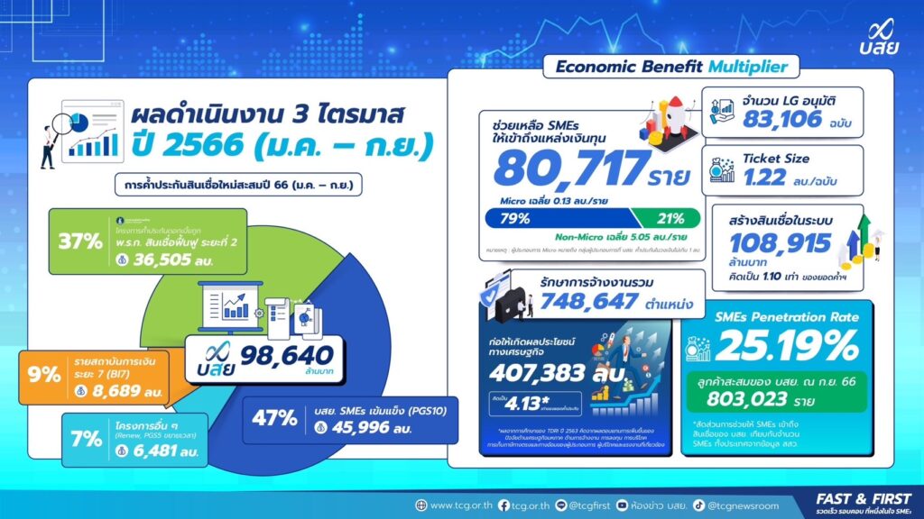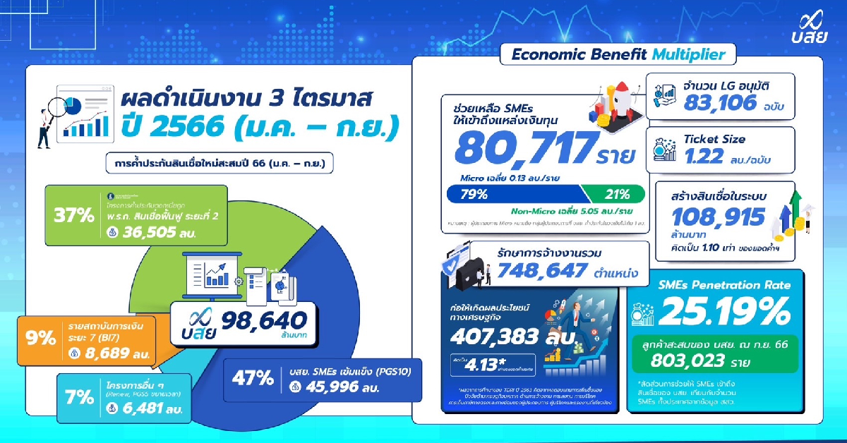 ประกอบด้วย ด้านผลดำเนินงาน “ค้ำประกันสินเชื่อ” ระหว่าง ม.ค.-ก.ย. 2566 อนุมัติค้ำประกันสินเชื่อ รวม 98,640 ล้านบาท สร้างมูลค่าทางเพิ่มเศรษฐกิจ ช่วย SMEs เข้าถึงแหล่งทุนในระบบ รวม 80,717 ราย (79% เป็นผู้ประกอบการ Micro ที่ บสย. ค้ำประกัน วงเงินไม่เกิน 1 ล้านบาท) สร้างสินเชื่อในระบบ 108,915 ล้านบาท คิดเป็น 1.10 เท่าของยอดค้ำประกันสินเชื่อ สร้างประโยชน์ทางเศรษฐกิจ รวม 407,383 ล้านบาท คิดเป็น 4.13 เท่าของยอดค้ำประกัน (สัดส่วนการช่วย SMEs เข้าถึงสินเชื่อเทียบกับจำนวน SMEs ทั้งประเทศ 25.19%) รักษาการจ้างงาน 748,647 ตำแหน่ง โดยมีลูกค้าค้ำประกันสะสม ณ 30 กันยายน 2566 จำนวน 803,023 ราย
