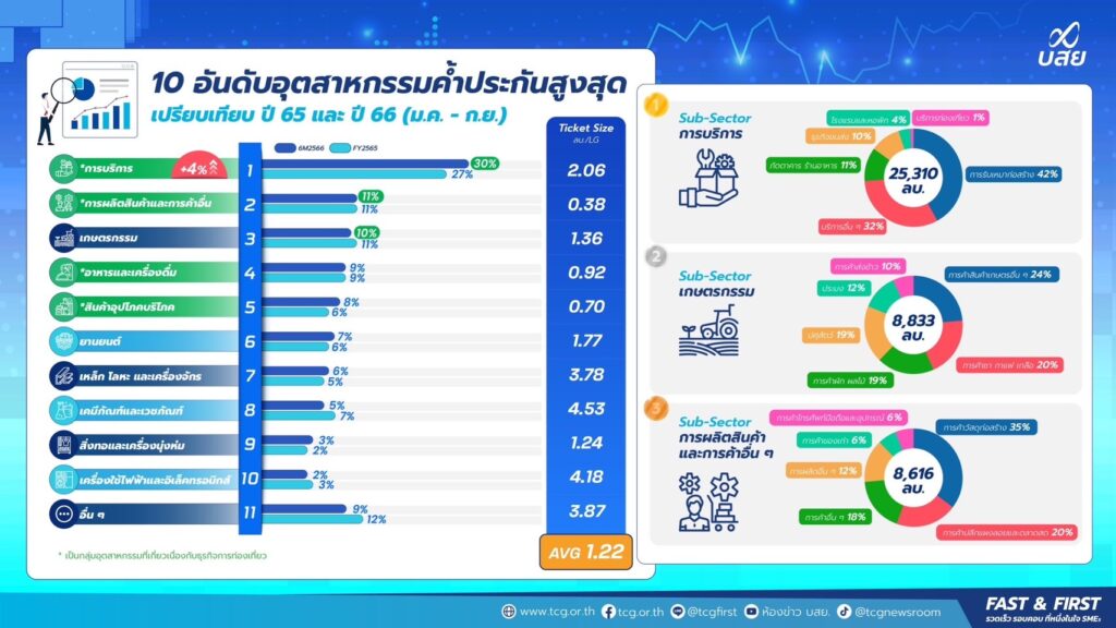 กลุ่มอุตสาหกรรมค้ำประกันสูงสุด 3 ลำดับแรก มาจากภาคบริการ ภาคเกษตรกรรม และภาคการผลิต ดังนี้ 1.ภาคการบริการ วงเงินค้ำ 25,310 ล้านบาท ประกอบด้วย ธุรกิจรับเหมาก่อสร้าง 42% ธุรกิจภัตตาคาร ร้านอาหาร 11% ธุรกิจขนส่ง 10% โรงแรมหอพัก 4% บริการท่องเที่ยว 1% และบริการอื่นๆ 32% 2.ภาคเกษตรกรรม วงเงินค้ำ 8,833 ล้านบาท ประกอบด้วย กลุ่มธุรกิจการค้าสินค้าเกษตรอื่นๆ 24% ธุรกิจชา กาแฟ เกลือ 20% การค้าส่งผักผลไม้ 19% ปศุสัตว์ 19% การค้าส่งข้าว 7% และประมง 12% 3.การผลิตสินค้าและการค้าอื่นๆ วงเงิน 8,616 ล้านบาท ประกอบด้วย กลุ่มธุรกิจการค้าวัสดุก่อสร้าง 35% การค้าปลีกแผงลอยและตลาดสด 20% การค้าอื่นๆ 18% การผลิตอื่นๆ 14% การค้าของเก่า 6% และการค้าโทรศัพท์มือถือและอุปกรณ์ 6%
