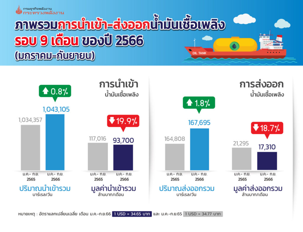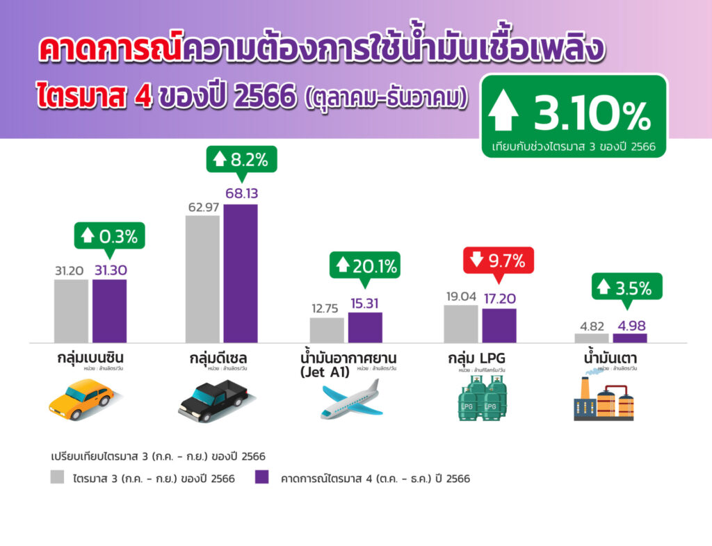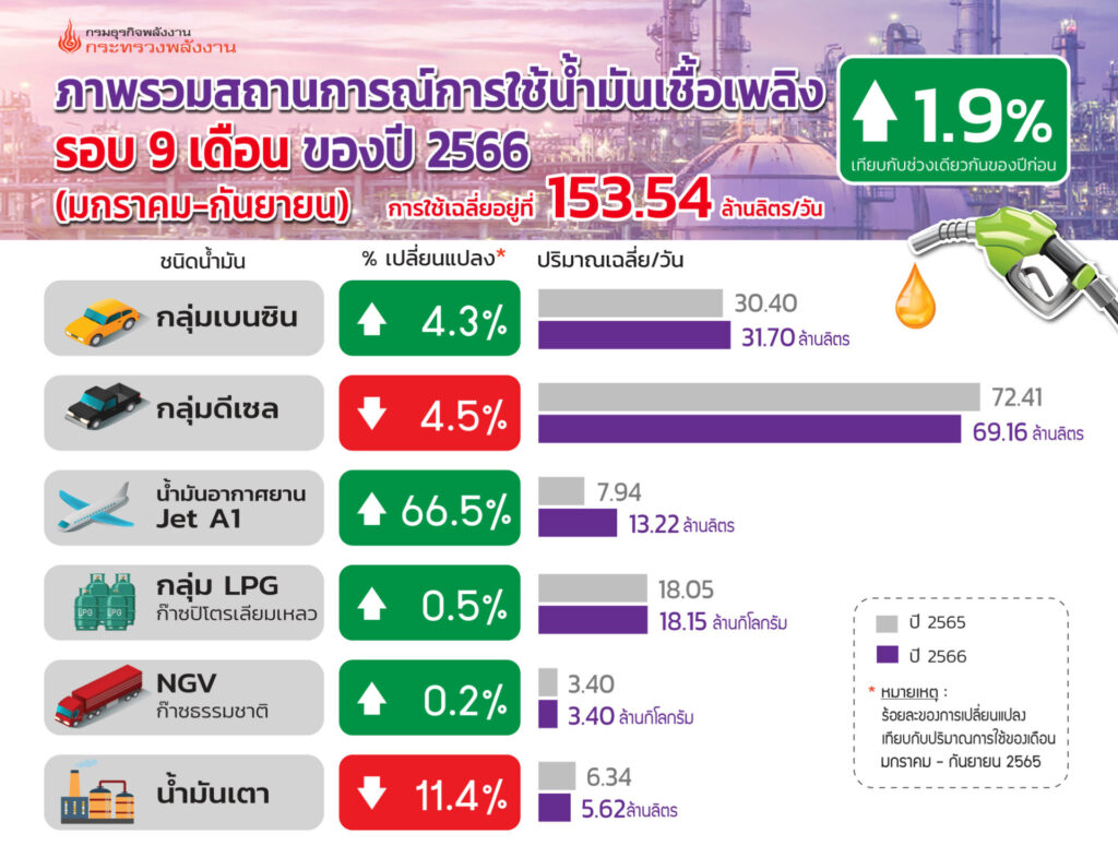สำหรับภาพรวมการใช้น้ำมันเชื้อเพลิงในช่วง 9 เดือน ตั้งแต่ ม.ค.-ก.ย.66 อยู่ที่ 153.34 ล้านลิตรต่อวัน เพิ่มขึ้น4.3% โดยเป็นการใช้น้ำมันกลุ่มเบนซินเพิ่มขึ้น 4.3% อยู่ที่ 31.70 ล้านลิตร/วัน น้ำมันอากาศยานเชิงพาณิชย์อยู่ที่ 13.44 ล้านลิตร/วัน เพิ่มขึ้น 66.5% การใช้ LPG อยู่ที่ 33.61 ล้านลิตร/วัน เพิ่มขึ้น 0.5% ก๊าซธรรมชาติสำหรับยานยนต์ (NGV ) อยู่ที่ 3.40 ล้าน กก./วัน เพิ่มขึ้น 0.2% กลุ่มดีเซลอยู่ที่ 69.16 ล้านลิตร/วัน ลดลง 4.5% จากฐานการผลิตปีก่อนที่สูงผิดปกติ (มีการใช้ดีเซลเพื่อผลิตไฟฟ้า) ประกอบกับเศรษฐกิจชะลอตัวบางส่วน น้ำมันเตาอยู่ที่ 5.62 ล้านลิตร/วัน ลดลง 11.4% จากผลกระทบภาคการผลิตที่ลดลงจากการส่งออกที่ชะลอ. -สำนักข่าวไทย