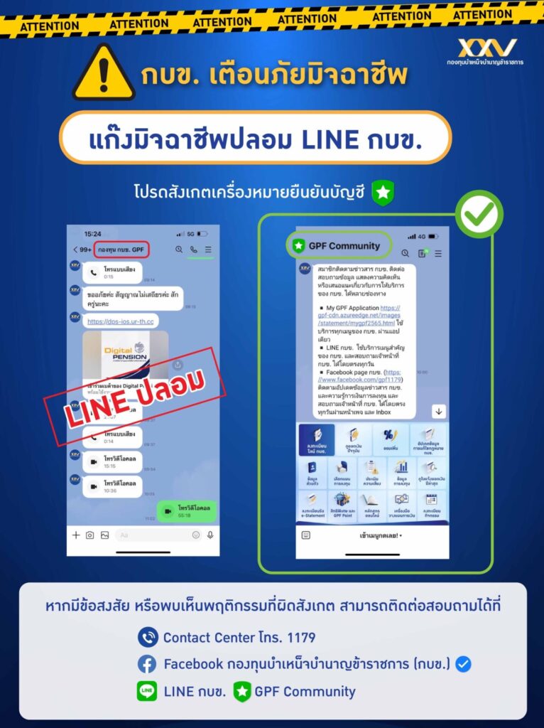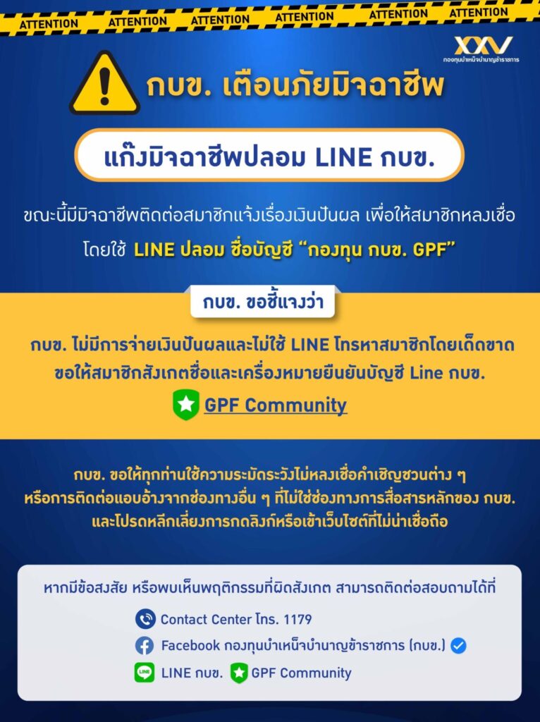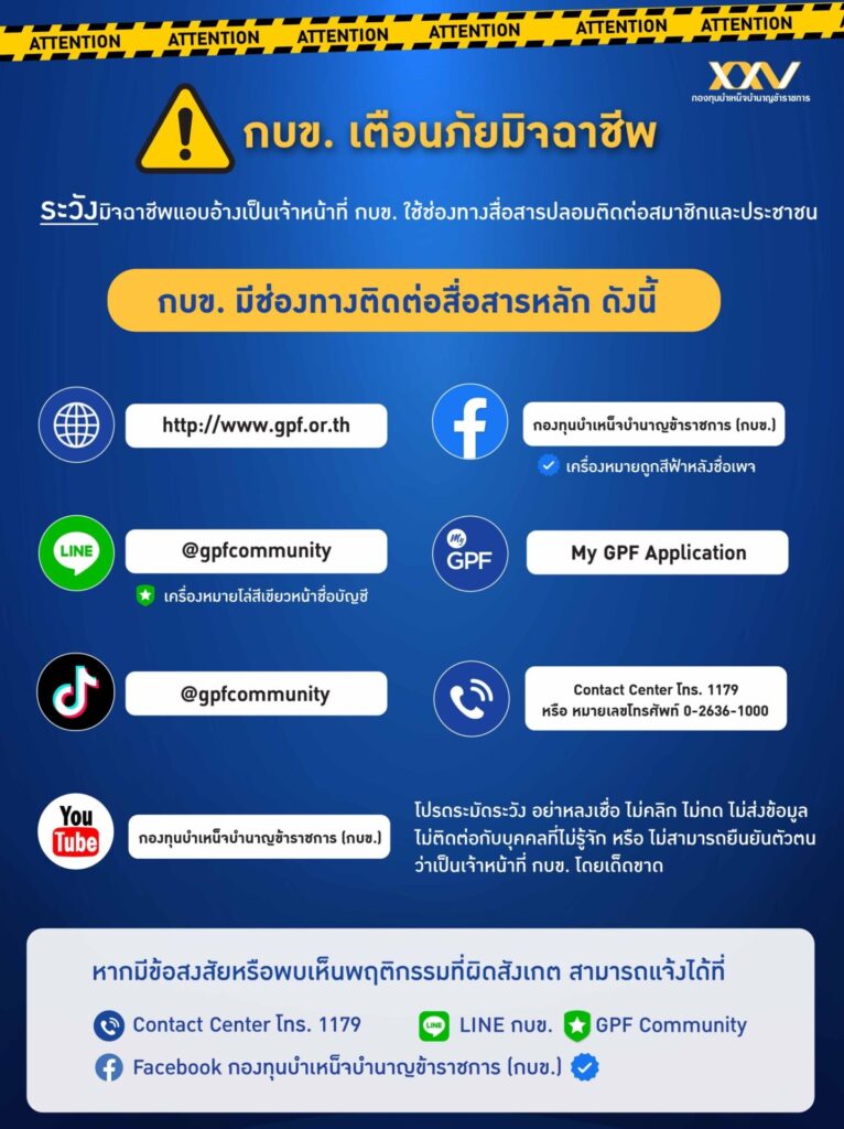 กบข. จึงขอแจ้งเตือนไปยังสมาชิก ผู้ออมต่อ และประชาชนทั่วไปให้ใช้ความระมัดระวังไม่หลงเชื่อคำเชิญชวนต่าง ๆหรือการติดต่อแอบอ้างจากช่องทางอื่น ๆ ที่ใช้ชื่อ “กบข.” หรือ “ตราสัญลักษณ์” ที่ไม่ใช่ช่องทางการสื่อสารหลักของกบข. และขอให้สมาชิกทุกท่านโปรดหลีกเลี่ยงการกดลิงก์หรือเข้าเว็บไซต์ที่ไม่น่าเชื่อถือ ขอให้สมาชิกสังเกตช่องทางติดต่อหลักของ กบข. Facebook page กองทุนบำเหน็จบำนาญข้าราชการ (กบข.) ที่มีเครื่องหมายถูกสีฟ้าหลังชื่อเพจเพื่อยืนยันบัญชีทางการ หรือ LINE Official Account ไอดีไลน์ @gpfcommunity ที่มีเครื่องหมายโล่สีเขียวหน้าชื่อบัญชี เพื่อยืนยันบัญชีทางการ ส่วนกรณีที่มีเจ้าหน้าที่ กบข. ติดต่อหาสมาชิกจะใช้เบอร์ 0-2636-1000 เท่านั้น จะไม่มีการใช้เบอร์ส่วนตัวโทรหาสมาชิกโดยเด็ดขาด พบเห็นพฤติกรรมดังกล่าว สามารถแจ้งมาได้ที่ศูนย์บริการข้อมูลสมาชิก โทร. 1179 .-สำนักข่าวไทย
