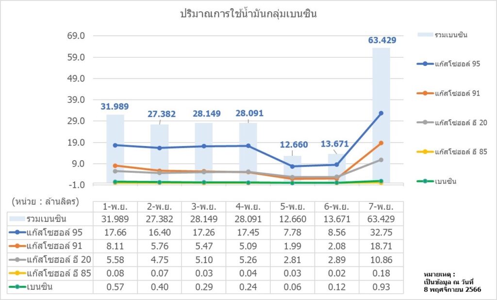 นายพีระพันธุ์ สาลีรัฐวิภาค รองนายกรัฐมนตรีและรัฐมนตรีว่าการกระทรวงพลังงาน กล่าวว่า กล่าวว่าจาดการตรวจสอบข้อมูลย้อนหลังพบว่า ปริมาณการใช้น้ำมันช่วงก่อนหน้าที่จะมีการลดราคาน้ำมัน โดยเฉพาะในช่วงระหว่างวันที่4 – 6 พฤศจิกายน 2566 ตัวเลขเบื้องต้น มีการใช้น้ำมันลดลงกว่า 60% ซึ่งปกติน้ำมันแก๊สโซฮอล์ 95 จะมีการใช้ประมาณวันละ 17 ล้านลิตร ก็เหลือเพียงประมาณวันละ 7 ล้านลิตร ส่วนน้ำมันแก๊สโซฮอล์ 91 ลดลงจากวันละ 6 ล้านลิตร เหลือวันละประมาณ 2 ล้านลิตร รวมทั้ง E20 และ E85 ก็มีปริมาณลดลงเช่นกัน อาจจะเป็นเพราะประชาชนได้รับทราบข่าวสารล่วงหน้าในนโยบายการลดราคาน้ำมันกลุ่มเบนซิน จึงชะลอการใช้บริการนอกจากนั้น ก็มีการเปลี่ยนการเติมชนิดน้ำมันจากน้ำมันแก๊สโซฮอล์ 95 มาเป็น 91 ทำให้น้ำมันแก๊สโซฮอล์ 91 มีไม่เพียงพอต่อความต้องการของประชาชน
