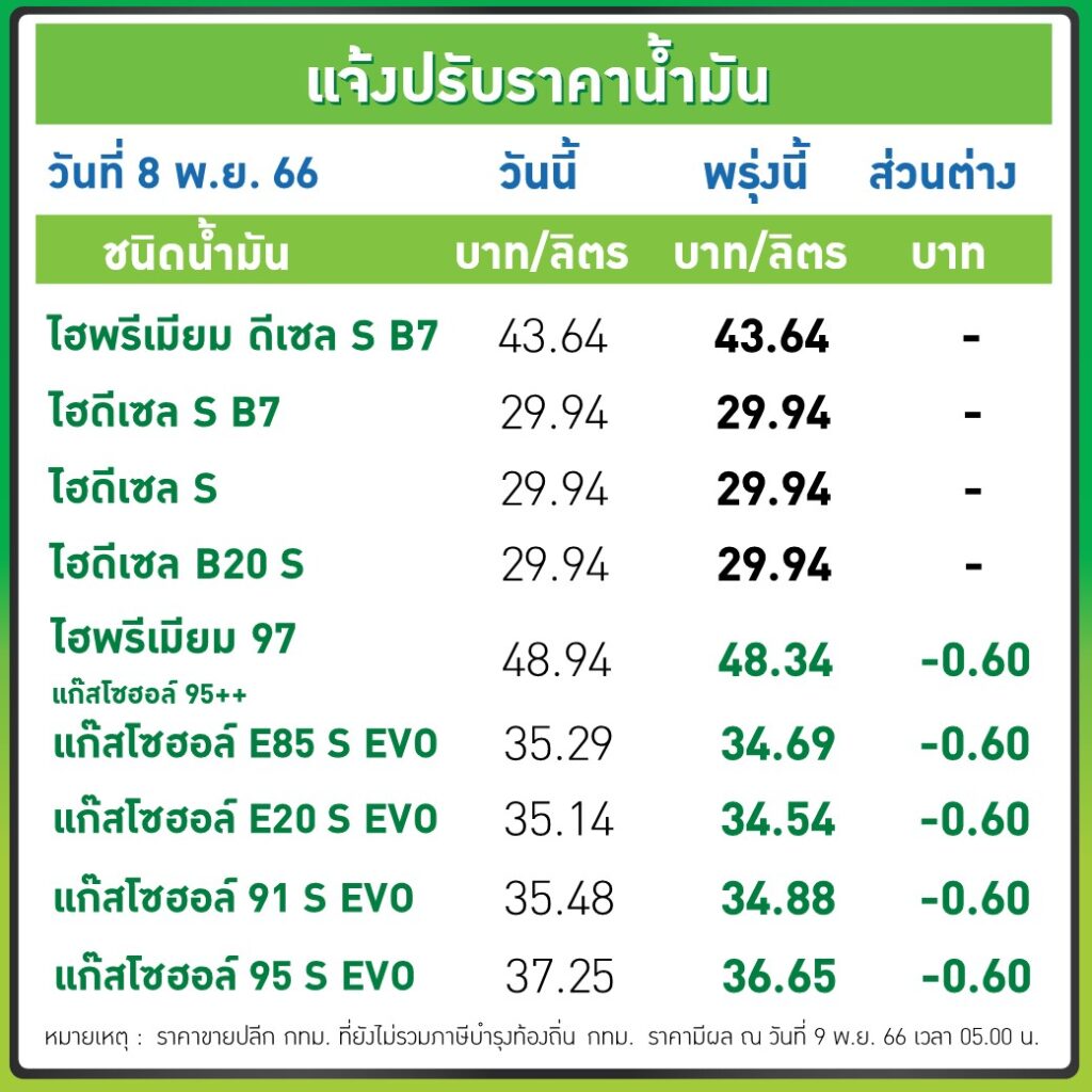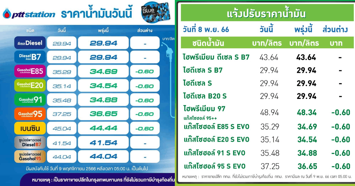 PTT Station ปรับราคาขายปลีกน้ำมันเบนซินและแก๊สโซฮอล์ทุกชนิดลง 0.60 บาทต่อลิตร ส่วน Premium GSH95 Premium ดีเซล และกลุ่มดีเซลคงเดิม มีผล 9 พ.ย. 2566 เวลา 05.00 น. เป็นต้นไป โดยราคาขายปลีกจะเป็น ดังนี้ ULG = 44.44, GSH95 = 36.65, E20 = 34.54, GSH91 = 34.88, E85 = 34.69, พรีเมี่ยม GSH95 = 44.04, HSD-B7 = 29.94, HSD-B10 = 29.94, พรีเมียมดีเซล B7 = 41.54 บาทต่อลิตร โดยราคาขายปลีกข้างต้นยังไม่รวมภาษีบำรุงกรุงเทพมหานคร