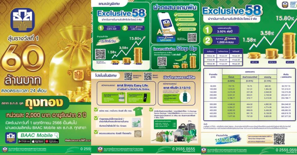 ธ.ก.ส. ชวนออมเงินแคมเปญ Exclusive 58 รับดอกเบี้ยแบบขั้นบันได สูงสุด 15.80% ต่อปี แถม A-rewards อีก 1,000 คะแนน แคมเปญ Step Up ฝากเงิน 10 เดือน รับดอกเบี้ยสูงสุดกว่า 6.20% ต่อปี และร่วมลุ้นรางวัลกับสลาก ธ.ก.ส. ชุดถุงทอง หน่วยละ 2,000 บาท ลุ้นรางวัล Grand Prize 60 ล้านบาท ถึง 24 งวด พร้อมบริการสินเชื่ออัตราดอกเบี้ยพิเศษหนุนธุรกิจที่เป็นมิตรกับสิ่งแวดล้อม ทั้งสินเชื่อ BCG สินเชื่อแทนคุณ และการให้คำปรึกษาด้านการเงิน พิเศษเฉพาะในงานแคมเปญถุงทองโบนัสสำหรับลูกค้าใหม่ เมื่อฝากสลาก ธ.ก.ส.ชุดถุงทอง ตั้งแต่ 10 ล้านบาทขึ้นไป รับโบนัสอีก 10,000 บาท ขอเชิญชวนทุกท่านร่วมกิจกรรมภายในบูธรับของที่ระลึกมากมาย และช้อปสินค้าคุณภาพดีจากเกษตรกรที่ได้มาตรฐาน A-Product ได้ที่บูธ ธ.ก.ส. ในงาน Money Expo เชียงใหม่ ระหว่างวันที่ 10-12 พ.ย.นี้ ณ เชียงใหม่ ฮอลล์ ศูนย์การค้าเซ็นทรัล เชียงใหม่ แอร์พอร์ต