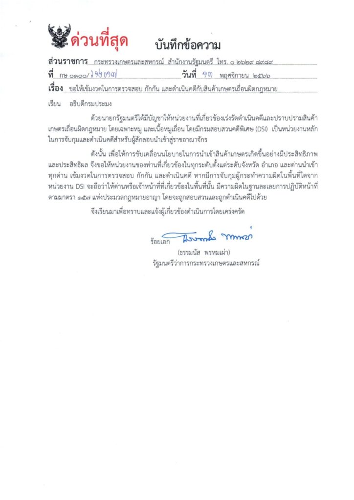 ร้อยเอกธรรมนัส พรหมเผ่า รัฐมนตรีว่าการกระทรวงเกษตรและสหกรณ์ลงนามในหนังสือด่วนถึงกรมปศุสัตว์ กรมประมง และกรมวิชาการเกษตร สั่งการให้เข้มงวดในการตรวจสอบ กักกัน และดำเนินคดีผู้ลักลอบนำเข้าสินค้าเกษตรผิดกฎหมาย ตามที่นายเศรษฐา ทวีสิน นายกรัฐมนตรีมีความห่วงกังวลและเน้นย้ำหน่วยงานที่เกี่ยวข้องเร่งรัดดำเนินคดีและปราบปรามสินค้าเกษตรเถื่อนผิดกฎหมาย โดยเฉพาะ “หมูเถื่อน” โดยมีกรมสอบสวนคดีพิเศษ (DSI) เป็นหน่วยงานหลักในการจับกุมและดำเนินคดีสำหรับผู้ลักลอบนำเข้าสู่ราชอาณาจักรไทย