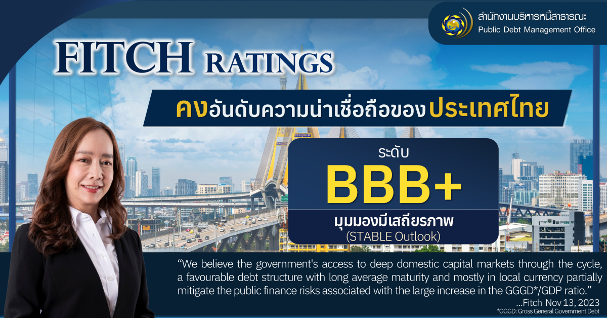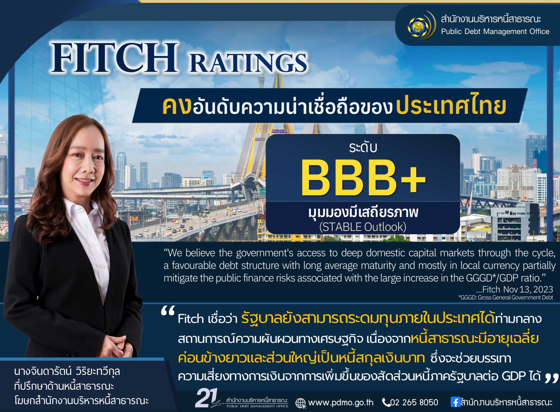 นางจินดารัตน์ วิริยะทวีกุล ที่ปรึกษาด้านหนี้สาธารณะ โฆษกสำนักงานบริหารหนี้สาธารณะ เปิดเผยว่า บริษัท Fitch Ratings (Fitch) ได้คงอันดับความน่าเชื่อถือของประเทศไทย (Sovereign Credit Rating) ที่ BBB+ และคงมุมมองความน่าเชื่อถือของประเทศไทย (Outlook) ณ ระดับมีเสถียรภาพ (Stable Outlook) หลังคาดว่า เศรษฐกิจไทยจะเติบโตอย่างต่อเนื่องจากร้อยละ 2.8 ในปี 2566 เพิ่มเป็นร้อยละ 3.8 ในปี 2567 มีปัจจัยหนุนจากส่งออกฟื้นตัว ความต้องการใช้จ่ายเพื่อซื้อสินค้าและบริการเพิ่มขึ้น จากการกระตุ้นการใช้จ่ายภาครัฐและนโยบายกระตุ้นเศรษฐกิจ จากการยกเว้นการตรวจลงตรา (Visa Exemption) ชั่วคราวแก่นักท่องเที่ยวจีนและอินเดีย ได้ส่งเสริมให้เกิดการฟื้นตัวของภาคการท่องเที่ยวอย่างรวดเร็ว