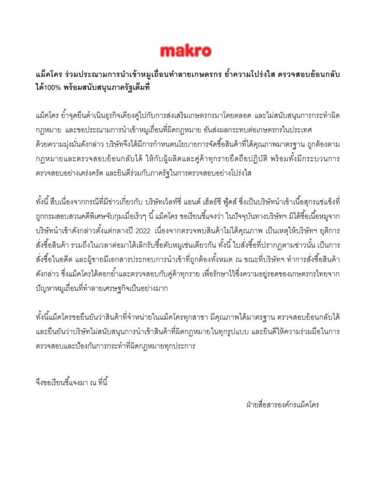ด้านแม็คโคร ออกแถลงการณ์ถึงกรณีข่าวเกี่ยวกับ บริษัทเวลท์ แอนด์ เฮลธ์ซี ฟูดส์ ซึ่งเป็นบริษัทนำเข้าเนื้อสุกรแช่แข็งที่ ถูกกรมสอบสวนคดีพิเศษจับกุมว่าในปัจจุบันบริษัทฯ มิได้ซื้อเนื้อหมูจาก บริษัทนำเข้าดังกล่าวตั้งแต่กลางปี 2022 เนื่องจากตรวจพบสินค้าไม่ได้คุณภาพ เป็นเหตุให้บริษัทฯ ยุติการ สั่งซื้อสินค้า รวมถึงในเวลาต่อมาได้เลิกรับซื้อตับหมูเช่นเดียวกัน