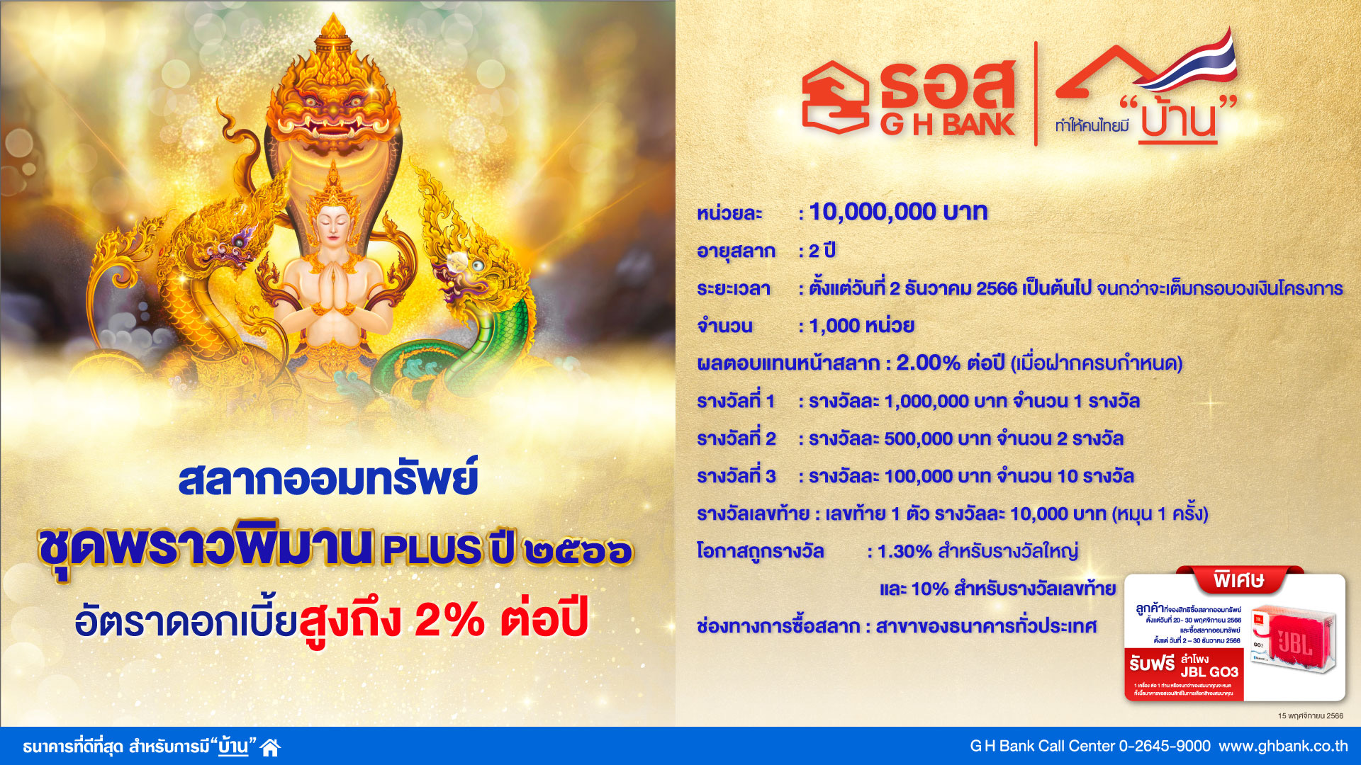 กรุงเทพฯ 15 พ.ย. -ธอส. มอบโชคส่งท้ายปี กับสลากออมทรัพย์สุดพรีเมียม “พราวพิมาน Plus” ปี 2566 หน่วยละ10 ล้านบาท ดอกเบี้ยสูง 2 % ต่อปี เปิดจองสิทธิ์ 20- 30 พ.ย.66 นี้