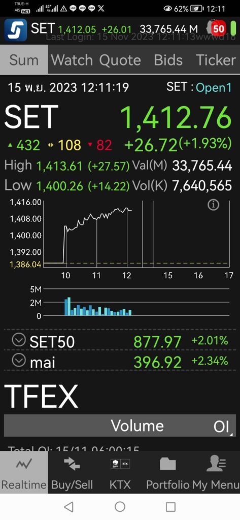 ด้านตลาดหุ้นไทยสดใส เวลา 12.11 น.น. ดัชนี SET มาอยู่ที่ 1,412.76 จุด เพิ่มขึ้น 26.72 จุด (+1.93%) ตอบรับเงินเฟ้อสหรัฐออกมาต่ำกว่าคาด อัตราผลตอบแทนพันธบัตรรัฐบาลสหรัฐ (บอนด์ยีลด์) 10 ปีปรับตัวลง และเงินบาทแข็งค่า โดยนักลงทุนคาดว่าเงินเฟ้อ สหรัฐที่ออกมาจะทำธนาคารกลางสหรัฐ (เฟด) ไม่ขยับขึ้นดอกเบี้ยอีก