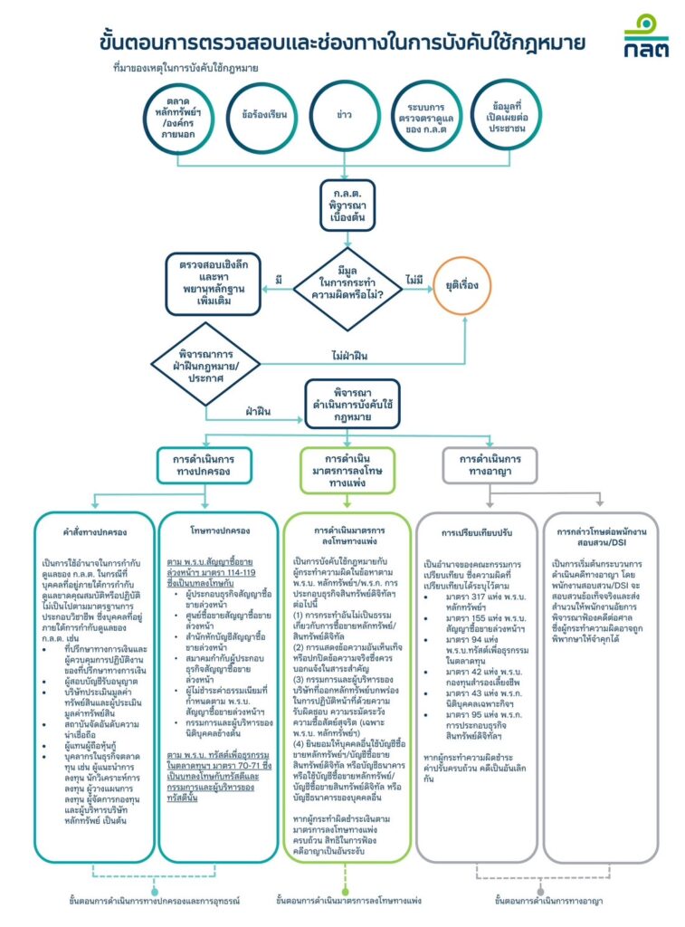 ทั้งนี้ การกำกับดูแลให้มีการปฏิบัติตามและดำเนินการบังคับใช้กฎหมายกับผู้กระทำความผิด กลต.มีช่องทางในการบังคับใช้กฎหมาย 3 ช่องทาง ได้แก่ การดำเนินการทางปกครอง การดำเนินการทางอาญา และการดำเนินมาตรการลงโทษทางแพ่ง