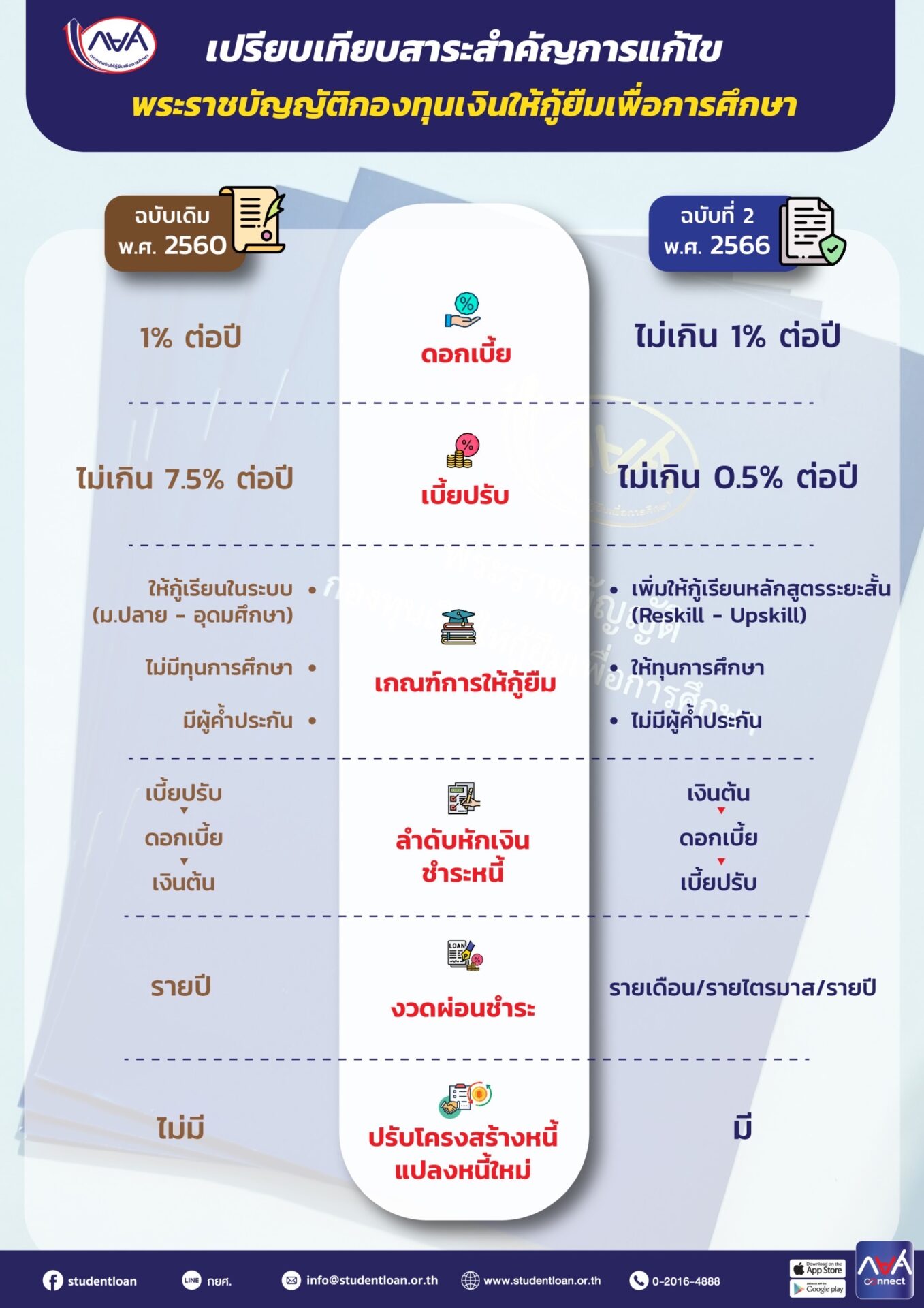 ในการหารือแก้หนี้ กยศ. ตาม พ.ร.บ.กยศ. ฉบับใหม่ มีผลบังคับใช้ไปแล้วเมื่อวันที่ 20 มี.ค.66 โดยกำหนดอัตราดอกเบี้ยเงินกู้ต่ำกว่าเดิม และให้คำนวณภาระหนี้ใหม่ โดยมีสาระสำคัญ ดังนี้ 1. อัตราดอกเบี้ยเงินกู้ไม่เกิน 1% ต่อปี (จากเดิม 1% ต่อปี) 2. กรณีผิดนัดชำระ ลดอัตราเบี้ยปรับเหลือไม่เกิน 0.5% ต่อปี (จากแต่เดิม 7.5% ต่อปี) 3. ไม่ต้องมีผู้ค้ำประกันในทุกกรณี 4. เพิ่มให้มีการกู้เรียนในหลักสูตรระยะสั้น และให้ทุนการศึกษา 5. ปรับลำดับการตัดชำระหนี้ใหม่ โดยหักต้นเงินเฉพาะส่วนที่ครบกำหนดก่อน ตามมาด้วยดอกเบี้ยหรือประโยชน์อื่นใด และเงินเพิ่มตามลำดับ 6. เพิ่มจำนวนงวดชำระเป็นรายเดือน รายไตรมาส และรายปี (จากแต่เดิมมีเฉพาะงวดชำระรายปี) 7. ช่วยเหลือผู้กู้ยืมเงินที่อยู่ระหว่างดำเนินคดี หรืออยู่ระหว่างการบังคับคดี ให้สามารถผ่อนผันการชำระเงินคืน ปรับโครงสร้างหนี้ หรือแปลงหนี้ใหม่ ตามเงื่อนไขที่คณะกรรมการกองทุนฯ กำหนด
