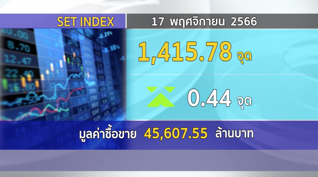 กทม. 17 พ.ย.- SET ปิดวันนี้ที่ 1,415.78 จุด เพิ่มขึ้น 0.44 จุด (+0.03%) มูลค่าซื้อขาย 45,607.55 ล้านบาท