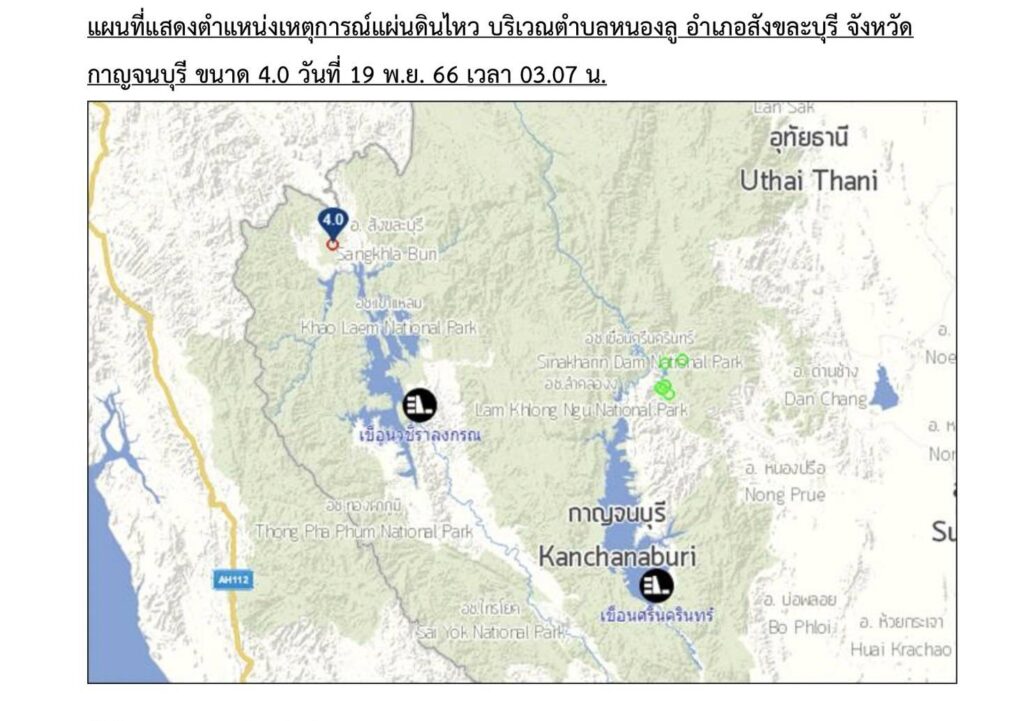 นายกำฤทธิ์ ใบแย้ม ผู้อำนวยการฝ่ายบำรุงรักษาโยธา การไฟฟ้าฝ่ายผลิตแห่งประเทศไทย (กฟผ.) เปิดเผยว่า วันนี้ (19 พฤศจิกายน 2566) เวลา 03.07 น. ได้เกิดเหตุแผ่นดินไหวมีจุดศูนย์กลางอยู่บริเวณ ต.หนองลู อ.สังขละบุรี จ.กาญจนบุรี ขนาด 4.0 ลึก 6 กิโลเมตร ห่างจากเขื่อนวชิราลงกรณ จ.กาญจนบุรี ไปทางทิศตะวันตกเฉียงเหนือประมาณ 47.87 กิโลเมตร เขื่อนศรีนครินทร์ จ.กาญจนบุรี 116.39 กิโลเมตร และเขื่อนภูมิพล จ.ตาก 236.96 กิโลเมตร กฟผ. ได้ตรวจสอบวัดอัตราเร่งสูงสุดที่เขื่อนวชิราลงกรณได้ 0.00608 g ในขณะที่เขื่อนถูกออกแบบรับแรงแผ่นดินไหว 0.1g จึงไม่มีผลกระทบต่อความมั่นคงเขื่อนของ กฟผ. ส่วนการตรวจสอบสภาพเขื่อนของ กฟผ. พบว่ามีความมั่นคงแข็งแรงเป็นปกติ จึงขอให้ประชาชนมั่นใจในความปลอดภัย