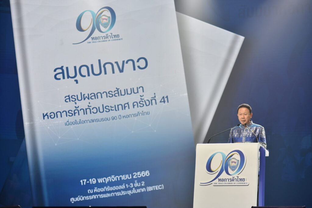 นายสนั่น อังอุบลกุล ประธานกรรมการหอการค้าไทยและสภาหอการค้าแห่งประเทศไทยกล่าวรายงาน สรุปผลการสัมมนาหอการค้าทั่วประเทศ ครั้งที่ 41 พร้อมยื่นสมุดปกขาวต่อนายเศรษฐา ทวีสิน นายกรัฐมนตรีที่มากล่าวปิดสัมมนาในครั้งนี้ โดยหอการค้าไทยและสภาหอการค้าแห่งประเทศไทย ผมขอกราบขอบพระคุณท่านนายกรัฐมนตรี และรัฐมนตรีว่าการกระทรวงการคลัง ที่ได้กรุณาให้เกียรติเข้าร่วมและจะได้กล่าวปาฐกถาพิเศษ งานสัมมนาหอการค้าทั่วประเทศในปีนี้