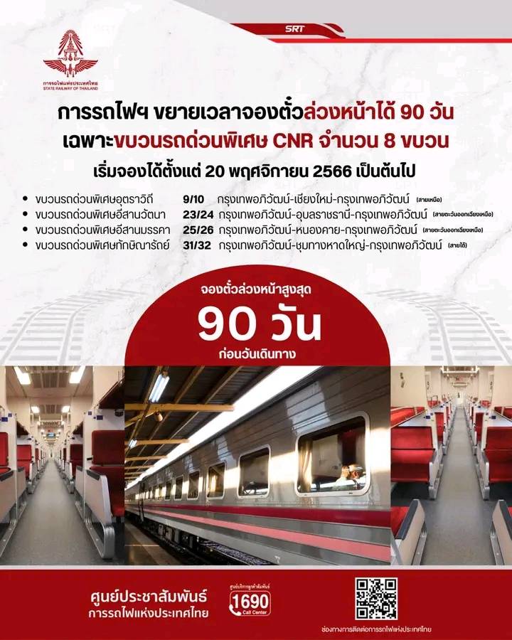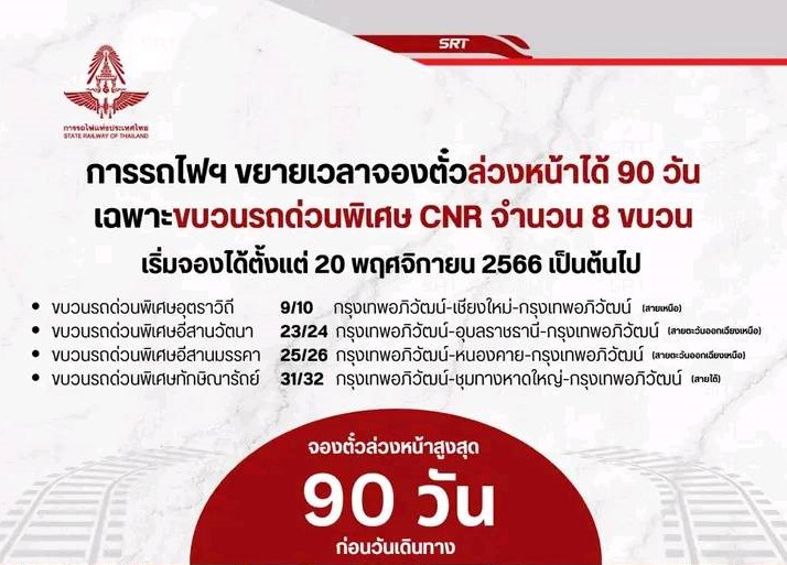 กรุงเทพฯ 20 พ.ย. – การรถไฟฯ แจ้งการเปิดจองล่วงหน้า 90 วันมุ่งหวังเพื่ออำนวยความสะดวกให้ประชาชนสามารถวางแผนล่วงหน้าในการเดินทาง ยืนยันการจองตั๋วจริง ไม่ยุ่งยากซับซ้อน แค่แจ้งสถานีต้นทาง- ปลายทาง จองได้ทันที
