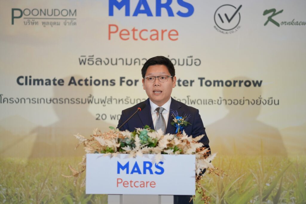 นายปิยรัฐ อมรฉัตร ผู้อำนวยการด้านการจัดซื้อ ภูมิภาคเอเชีย บริษัท มาร์ส เพ็ทแคร์ (ประเทศไทย) จำกัด กล่าวว่า บริษัทเป็นฐานการผลิตอาหารสัตว์เลี้ยงสำหรับภูมิภาคเอเชียแปซิฟิก ได้ให้ความสำคัญของการผลิตที่เป็นมิตรต่อสิ่งแวดล้อม จึงร่วมลงนามบันทึกข้อตกลงความร่วมมือ (MOU) กับบริษัทคู่ค้า 6 ราย ดำเนินกิจกรรม “Climate Actions For A Better Tomorrow” โดยมีเป้าหมายลดการปล่อยก๊าซเรือนกระจกตลอดห่วงโซ่การผลิต ผ่านโครงการเกษตรกรรมฟื้นฟู โดยเริ่มดำเนินโครงการในการปลูกข้าวโพดและข้าวนำร่องที่ จ.นครราชสีมา และ จ.ลพบุรี