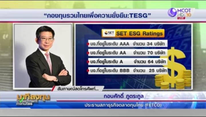 กรุงเทพฯ 21 พ.ย. – นายกอบศักดิ์ ภูตระกูล ประธานคณะกรรมการสภาธุรกิจตลาดทุนไทย (FETCO) เผยทุก บลจ.สนใจเตรียมออกกองทุนไทยเพื่อความยั่งยืน Thailand ESG Fund (TESG) โดยคาดว่า บลจ.ต่าง ๆ จะเริ่มขายกองทุน TESG ได้ตั้งแต่วันที่ 1 ธ.ค.66