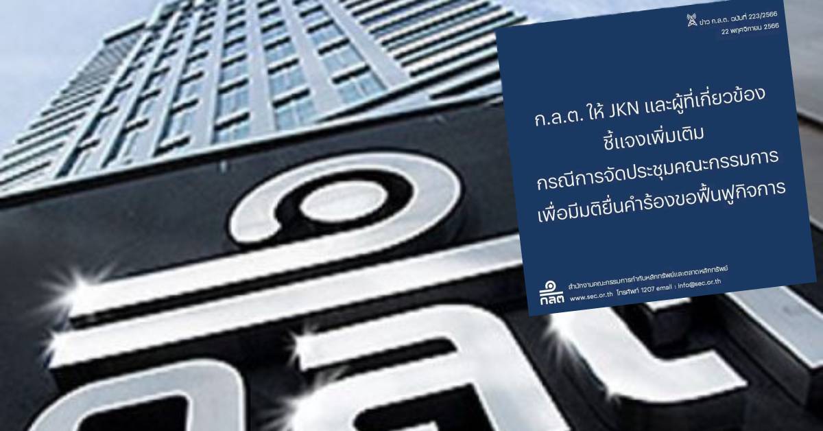 กลต.แจ้งว่า ตามที่ JKN ได้ชี้แจงข้อมูลผ่านระบบสารสนเทศฯ เมื่อวันที่ 20 พ.ย.66 เกี่ยวกับกรณีกรรมการไม่ได้รับหนังสือเชิญประชุมคณะกรรมการบริษัทครั้งที่มีการพิจารณาวาระการยื่นคำร้องขอฟื้นฟูกิจการ ซึ่งเป็นหนึ่งในเหตุที่ทำให้กรรมการบางรายของ JKN ลาออก รวมทั้งแจ้งว่า JKN ไม่ได้ส่งหนังสือเชิญประชุมให้แก่กรรมการ เนื่องจากมีความจำเป็นเร่งด่วนโดยใช้วิธีเรียกประชุมผ่านทางโทรศัพท์นั้น อย่างไรก็ดี เนื่องจากกรณีดังกล่าวเกี่ยวข้องกับการปฏิบัติหน้าที่ของกรรมการของบริษัทจดทะเบียน และมีข้อมูลเกี่ยวกับการเรียกประชุมคณะกรรมการในบางส่วนที่ยังไม่ชัดเจน กลต.จึงมีหนังสือให้ JKN และผู้ที่เกี่ยวข้องชี้แจงข้อเท็จจริงที่เกิดขึ้นเพิ่มเติม พร้อมให้เปิดเผยข้อมูลผ่านตลาดหลักทรัพย์ฯ เพราะ JKN มีหน้าที่ต้องเปิดเผยข้อมูลให้ถูกต้องครบถ้วนตาม พ.ร.บ.หลักทรัพย์และตลาดหลักทรัพย์ พ.ศ.2535 โดยกรรมการบริษัทต้องปฏิบัติหน้าที่ด้วยความรับผิดชอบ ความระมัดระวัง และความซื่อสัตย์สุจริต ซึ่งรวมถึงการดูแลบริษัทให้ปฏิบัติตามกฎหมาย และหากพบว่า JKN กรรมการบริษัทหรือบุคคลใดกระทำไม่เป็นไปตามกฎหมาย กลต.จะพิจารณาดำเนินการต่อไป