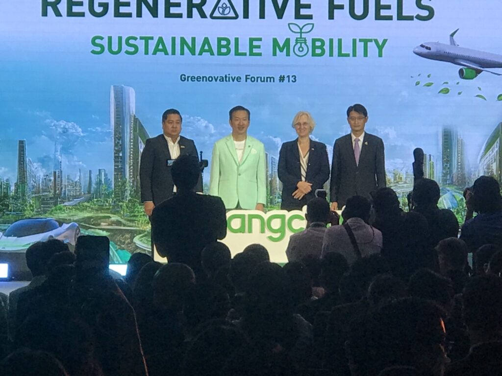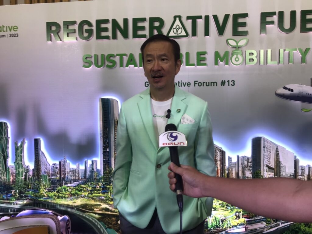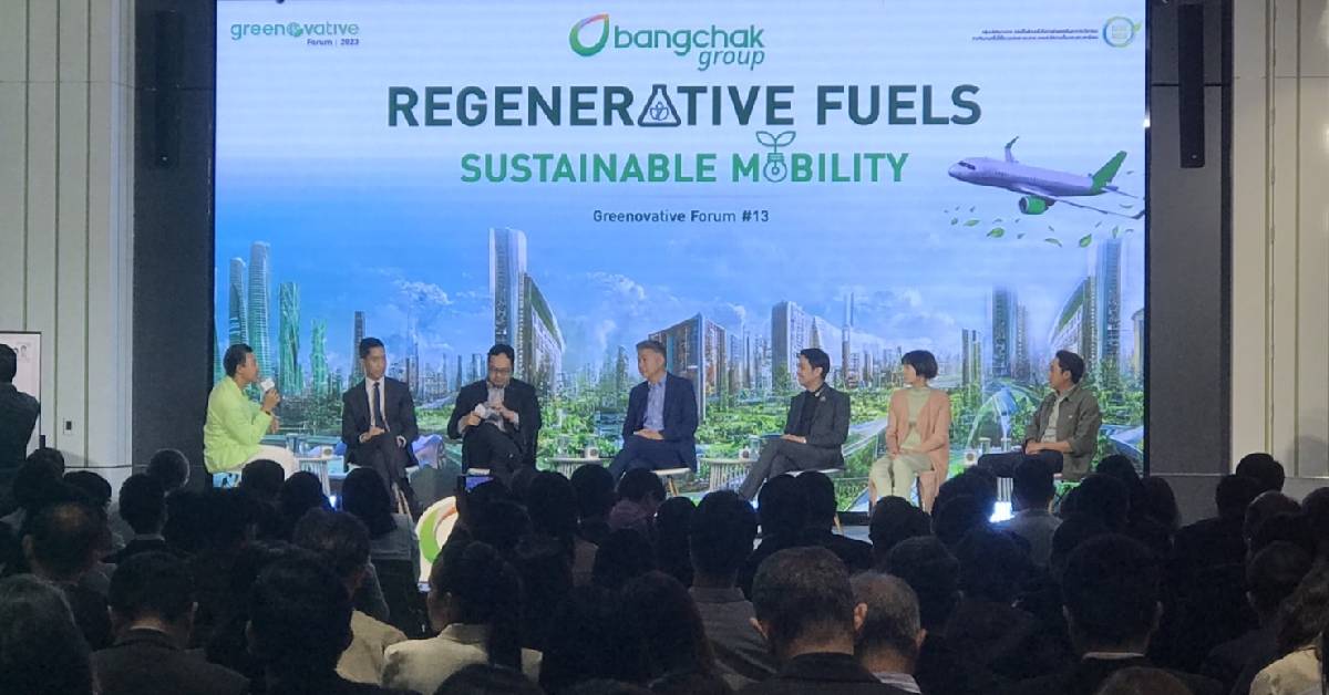 บริษัท บางจาก คอร์ปอเรชั่น จำกัด (มหาชน) จัดงานสัมมนา Greenovative Forum ครั้งที่ 13 ในหัวข้อ Regenerative Fuels:Sustainable Mobility เพื่อนำเสนอประเด็นเกี่ยวกับเชื้อเพลิงอนาคตเพื่อตอบโจทย์การเดินทางอย่างยั่งยืนนายชัยวัฒน์ โควาวิสารัช ประธานเจ้าหน้าที่บริหารกลุ่มบริษัทบางจากและกรรมการผู้จัดการใหญ่ บริษัท บางจาก คอร์ปอเรชั่น จำกัด (มหาชน) กล่าวในงานสัมมนาว่า โลกเราบริโภคพลังงานต่อวัน 1.7 ล้านล้านล้านจูนต่อวัน หรือเปรียบเทียบได้กับพลังงานที่ใช้ในเครื่องบินแอร์บัส 320 บินรอบโลกวันละ 3.5 แสนรอบต่อวัน หรือการเดินทางไปกลับระหว่างโลกกับดวงจันทร์ วันละ 37,000 รอบ นี่คือพลังงานที่เราใช้ต่อวัน แล้วเราจะนำพลังงานมาจากไหน เราบริโภคน้ำมัน 220 ล้านบาร์เรลต่อวัน ถ้าเปรียบเทียบกับการบริโภคน้ำ เท่ากับ น้ำ 35,000 ล้านลิตรต่อวัน ประชากรโลกมีทั้งหมด 8,000 ล้านคน เท่ากับคนหนึ่งจะบริโภคน้ำมัน 4.4 ลิตรต่อวัน ขณะที่เราบริโภคน้ำ 2 ลิตรต่อวัน จะเห็นว่าเราใช้พลังงานเยอะมาก โดยน้ำมัน 1 ลิตรหรือน้ำหนัก 1 กิโลกรัม รถยนต์จะวิ่งได้ 15 กิโลเมตร แต่ถ้าเป็นแบตเตอรี่ หนัก 1 กิโลกรัม รถยนต์จะวิ่งได้ไม่ถึง 1 กิโลเมตร ถ้าจะให้รถยนต์วิ่งได้ 15 กิโลเมตร จะต้องใส่แบตเตอรี่น้ำหนัก 15 กิโลกรัมเข้าไป ดังนั้นน้ำมันจึงยังเป็นที่นิยม ประชากรโลกส่วนใหญ่จะอยู่ในทวีปเอเชีย โดยน้ำมันส่วนใหญ่จะอยู่ตามชายฝั่ง อยู่ในทะเลลึก ต้องมีการเคลื่อนย้าย การเคลื่อนย้ายพลังงานที่ง่ายที่สุด ถ้าเป็นก๊าซจะส่งไปตามท่อ แต่ถ้าเป็นของเหลวจะใช้รถยนต์ขนส่งหรือรถไฟก็ได้ ถ้าเป็นถ่านหินจะขนส่งค่อนข้างลำบาก ถ้าเป็นอิเล็กตรอนจะส่งมาตามสาย ซึ่งสิ่งที่เราคุยกันอยู่คือ กรีน อิเล็กตรอน คือ การผลิตอิเล็กตรอนจากพลังงานหมุนเวียน ถ้าเราต้องการพลังงานหมุนเวียนจาก ดิน น้ำ ลม ไฟ พลังงานแสงอาทิตย์ เช่น สมมติว่าการใช้พลังงาน 220 ล้านบาร์เรลต่อวัน จะต้องสร้างเขื่อนภูมิพลถึง 1 แสน 3 หมื่นเขื่อนภูมิพลเพื่อมาใช้เป็นพลังงานใน 1 วัน และเราต้องนำพลังงานเหล่านี้มาให้ผู้บริโภคในเมือง เราต้องสร้างสายไฟแรงสูงอีก 320 ล้านกิโลเมตร หรือ การพันสายไฟรอบโลก 8,000 ครั้ง