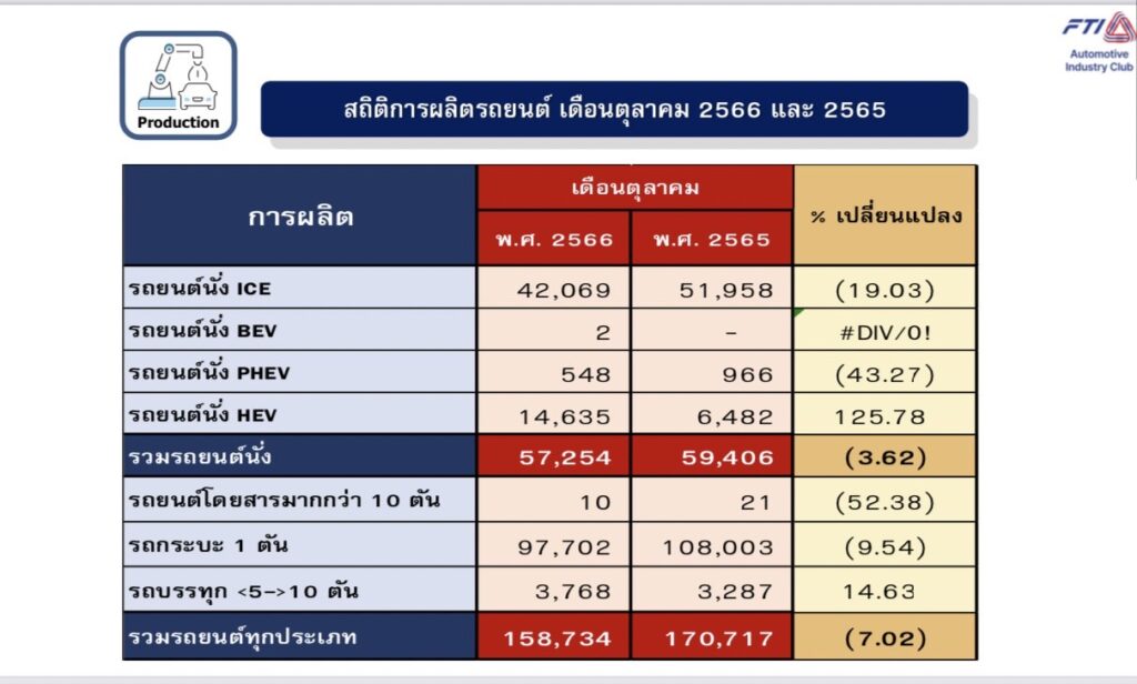 นายสุรพงษ์ ไพสิฐพัฒนพงษ์ รองประธานและโฆษกกลุ่มอุตสาหกรรมยานยนต์ สภาอุตสาหกรรมแห่งประเทศไทย (ส.อ.ท.) เปิดเผยว่า เดือนตุลาคม 2566 มียานยนต์ไฟฟ้าป้ายแดงประเภท BEV จดทะเบียนใหม่จำนวน 9,808 คัน เพิ่มขึ้นจากเดือนตุลาคมปีที่แล้วร้อยละ 400.41 ส่งผลให้ 10 เดือนของปี 2566 หรือ ตั้งแต่เดือนมกราคม–ตุลาคม มียานยนต์ประเภทไฟฟ้า (BEV) จดทะเบียนใหม่สะสมจำนวน 77,737 คัน เพิ่มขึ้นจากช่วงเดียวกันของปีที่แล้วร้อยละ 409.98 ส่วนการผลิตรถยนต์เดือนตุลาคม 2566 ลดลงจากช่วงเดียวกันของปีที่แล้วร้อยละ 7.02 โดยมีจำนวนรถยนต์ทั้งสิ้น 158,734 คัน และลดลงจากเดือนกันยายน 2566 ร้อยละ 3.27 เรื่องจากการผลิตเพื่อส่งออกลดลงร้อยละ 3.57 เพราะฐานสูงในปีที่แล้ว และผลิตเพื่อขายในประเทศลดลงร้อยละ 11.65 จากการผลิตรถกระบะลดลงร้อยละ 27.44 ตามยอดขายรถกระบะที่ลดลงถึงร้อยละ 37.93 จากการเข้มงวดการอนุมัติสินเชื่อของสถาบันการเงิน