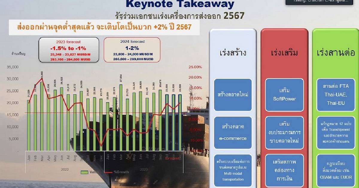 สำหรับปี 2567 สินค้าเกษตร อาหาร ยานยนต์และชิ้นส่วน เป็นตัวขับเคลื่อนหลัก และการส่งออกนี้ อยู่ภายใต้สมมติฐานที่ว่าอัตราแลกเปลี่ยน เฉลี่ยอยู่ที่ 33-35 บาท/ดอลลาร์สหรัฐ ราคาน้ำมันดิบดูไบ เฉลี่ย 80-90 ดอลลาร์สหรัฐ/บาร์เรล