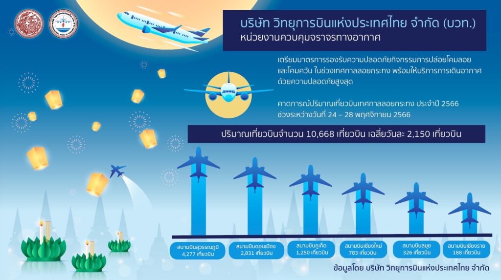 นายณพศิษฏ์ จักรพิทักษ์ กรรมการผู้อำนวยการใหญ่ บริษัท วิทยุการบินแห่งประเทศไทย จำกัด (บวท.) เปิดเผยว่าเทศกาลลอยกระทง ปี 2566 หลายจังหวัดได้เตรียมการจัดกิจกรรมเพื่อสืบสานประเพณีวัฒนธรรมที่ดีงาม ซึ่งมีการเชิญชวนชาวไทยและชาวต่างประเทศเข้ามาร่วมงานประเพณีลอยกระทง ควบคู่กับการปลูกฝังแนวคิดการท่องเที่ยวอย่างรับผิดชอบสู่ความยั่งยืน ทั้งนี้ บวท. ได้คาดการณ์ปริมาณเที่ยวบินเทศกาลลอยกระทง ประจำปี 2566 ช่วงระหว่างวันที่ 24 – 28 พฤศจิกายน 2566 จะมีปริมาณเที่ยวบินจำนวน 10,668 เที่ยวบิน เฉลี่ยวันละ 2,150 เที่ยวบิน
