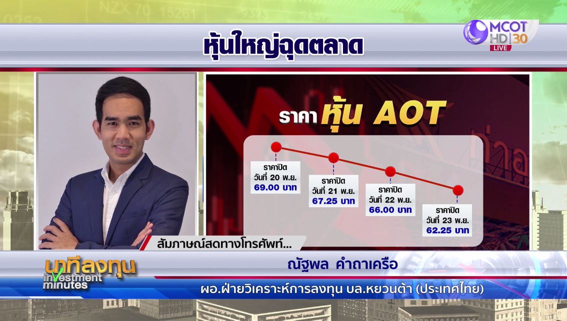 24 พ.ย. – AOT ราคาปรับลงมาซึมซับข่าวลบไปเรียบร้อยแล้ว วันนี้หากมีการ Forced Sell บ้าง เชื่อว่าน่าจะเป็นชอตสุดท้ายของขาลง ใครมีแนะนำไม่ต้องขาย ให้ถือต่อ .- สำนักข่าวไทย